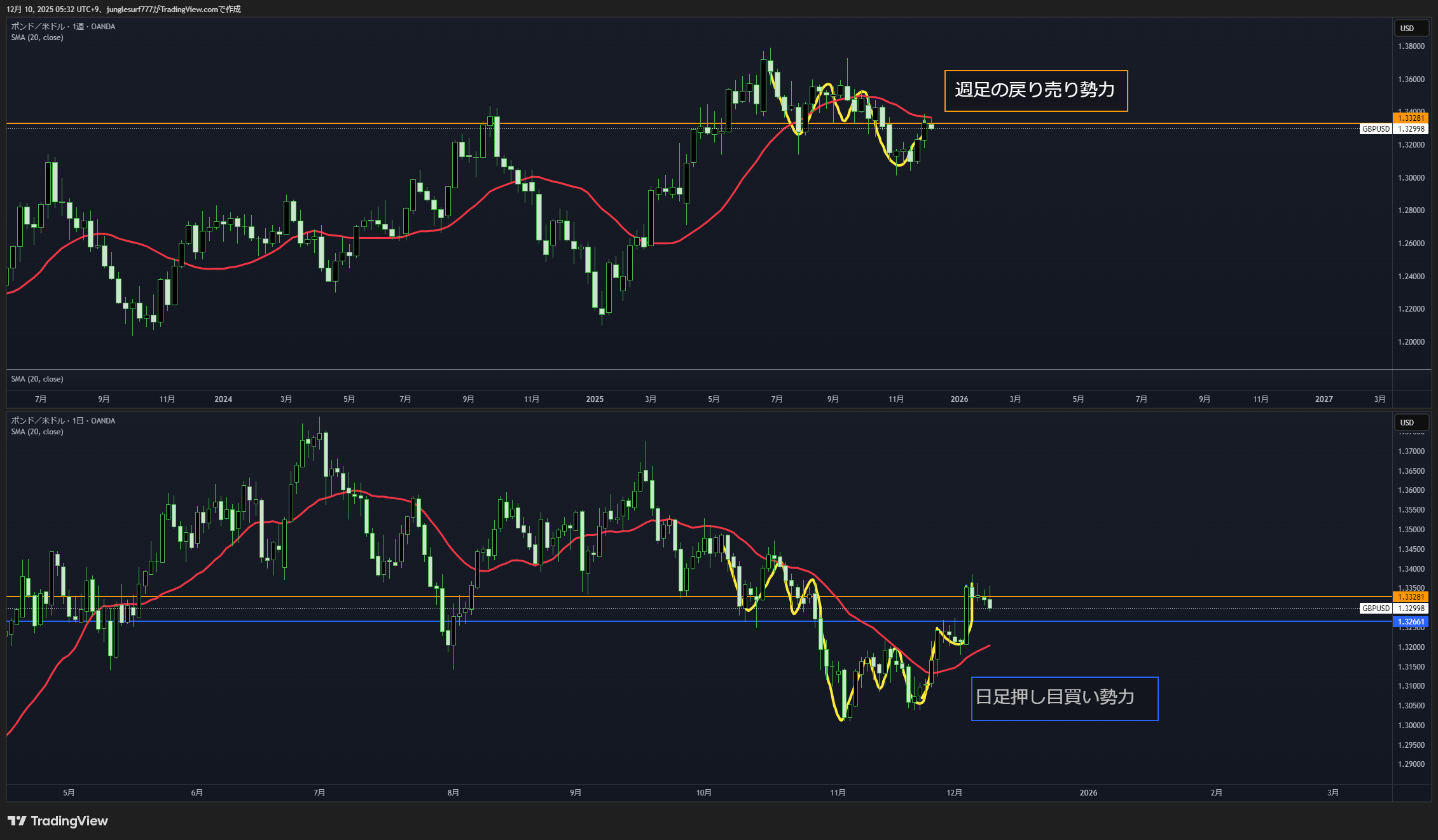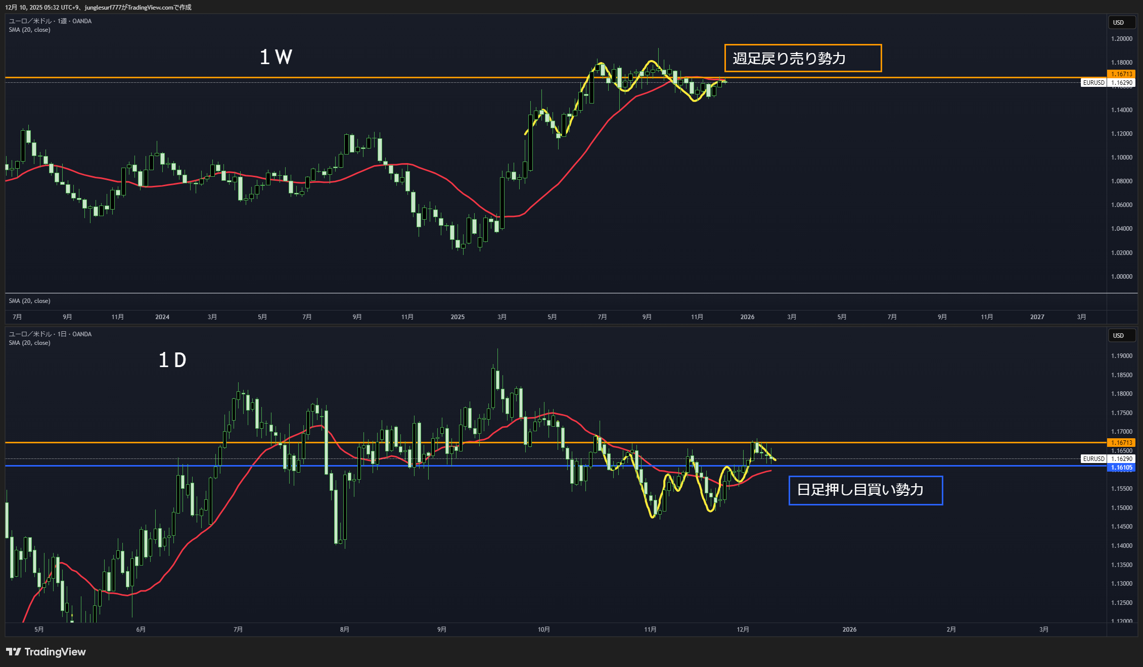 週足の戻り売りと日足の押し目買いがぶつかって戦争が起きやすいエリア。