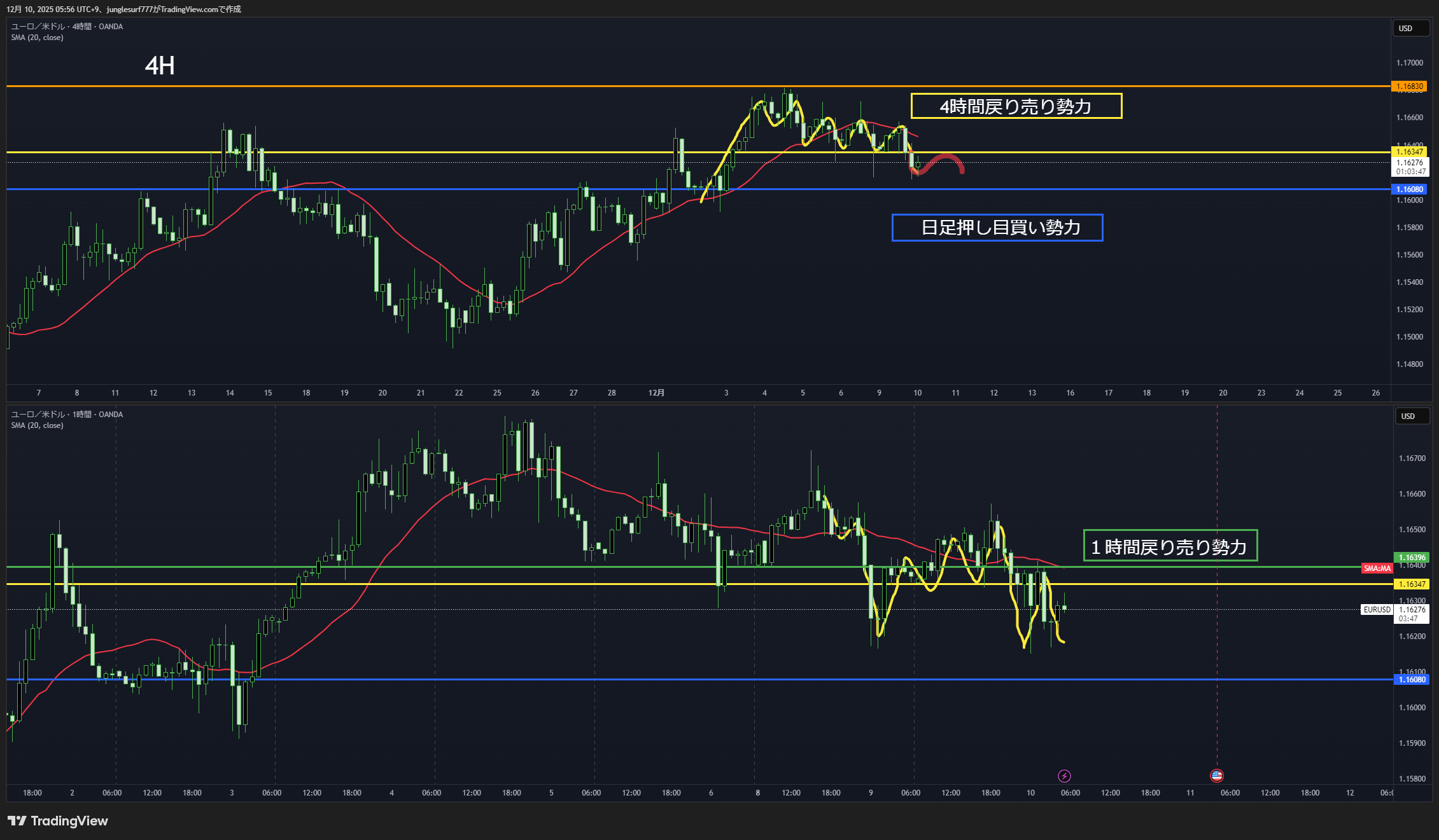 その状態が4時間足のヒゲや、1時間足に現れている。