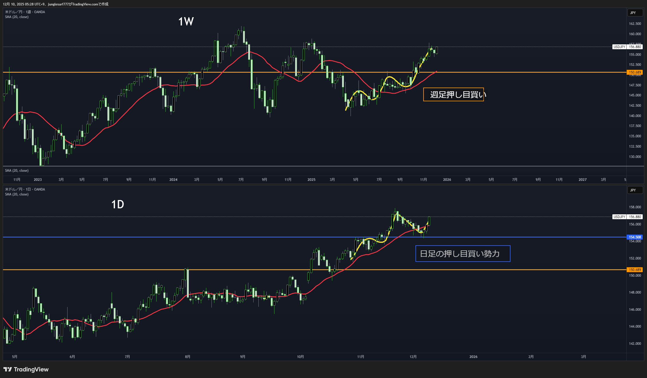 日足の押し目買い勢力が迫って来ているので、難しくなりそう。