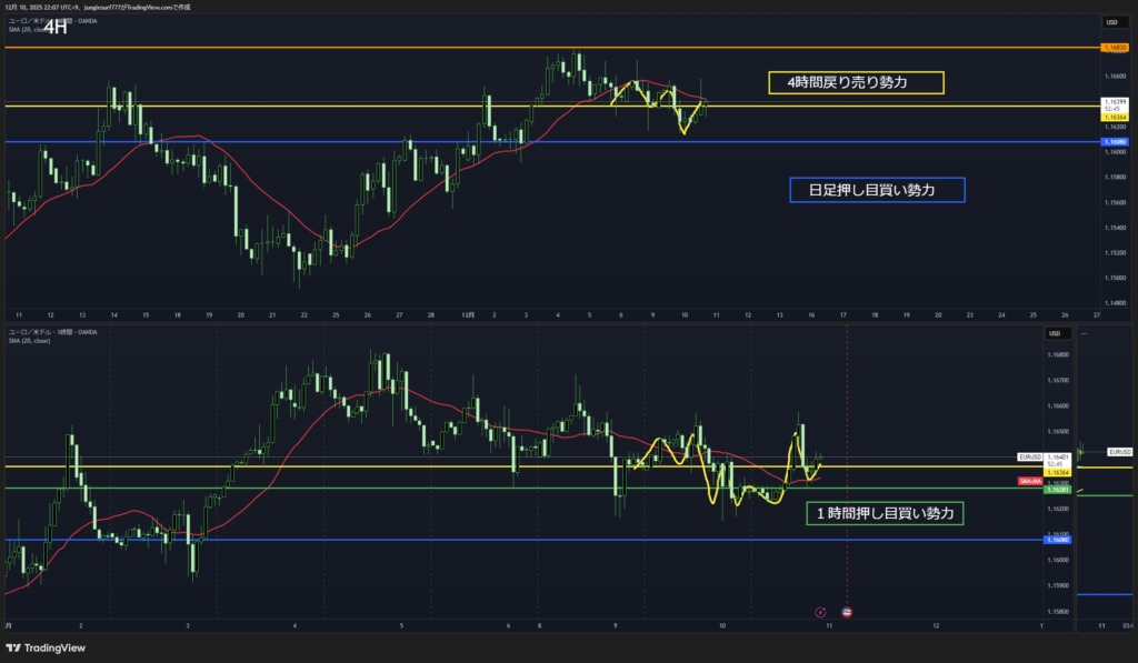 週足の戻り売りと日足の押し目買いがぶつかって戦争が起きやすいエリア。
