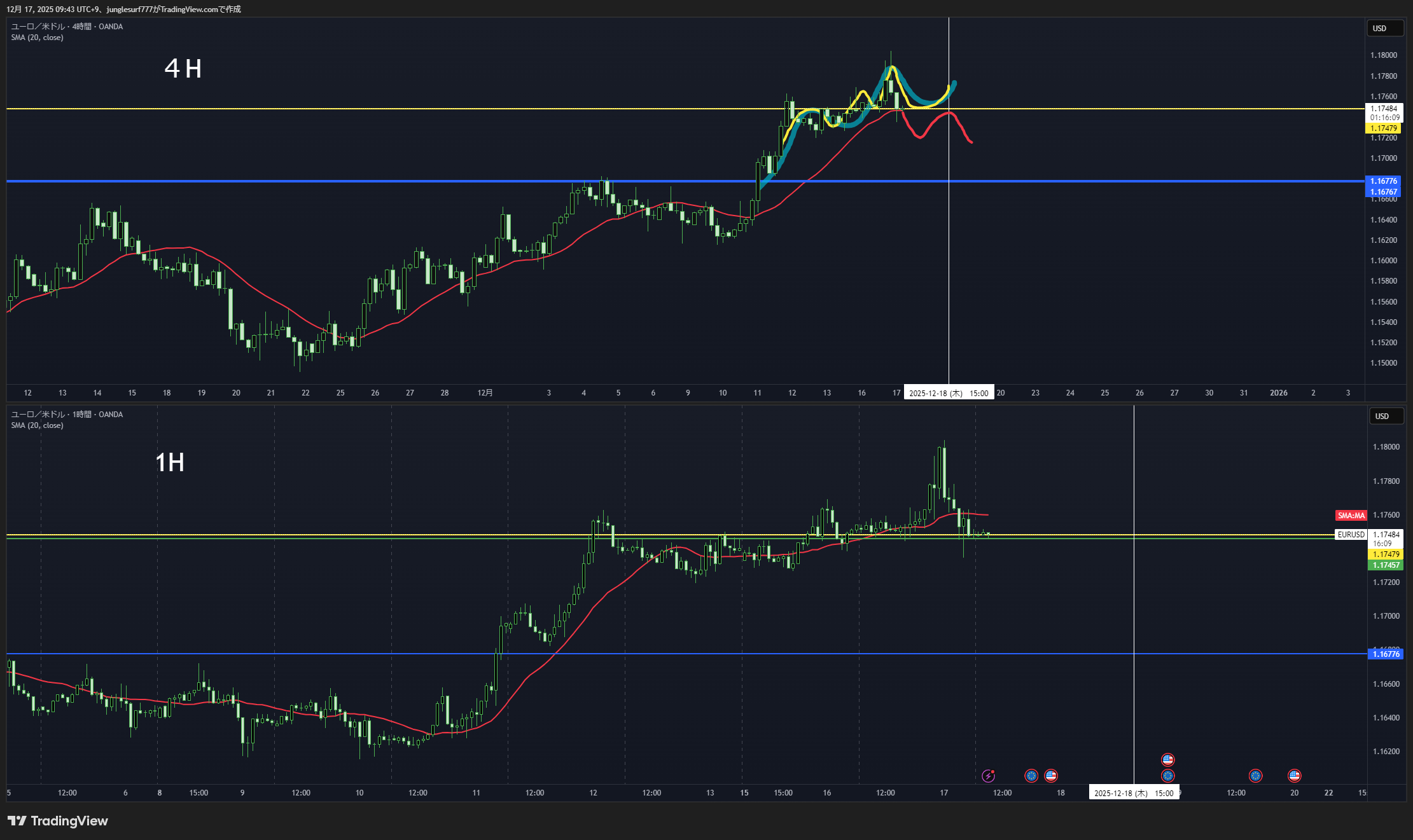 4HのMAに沿って大きな水色のダウカウントの波がでる可能性がある
