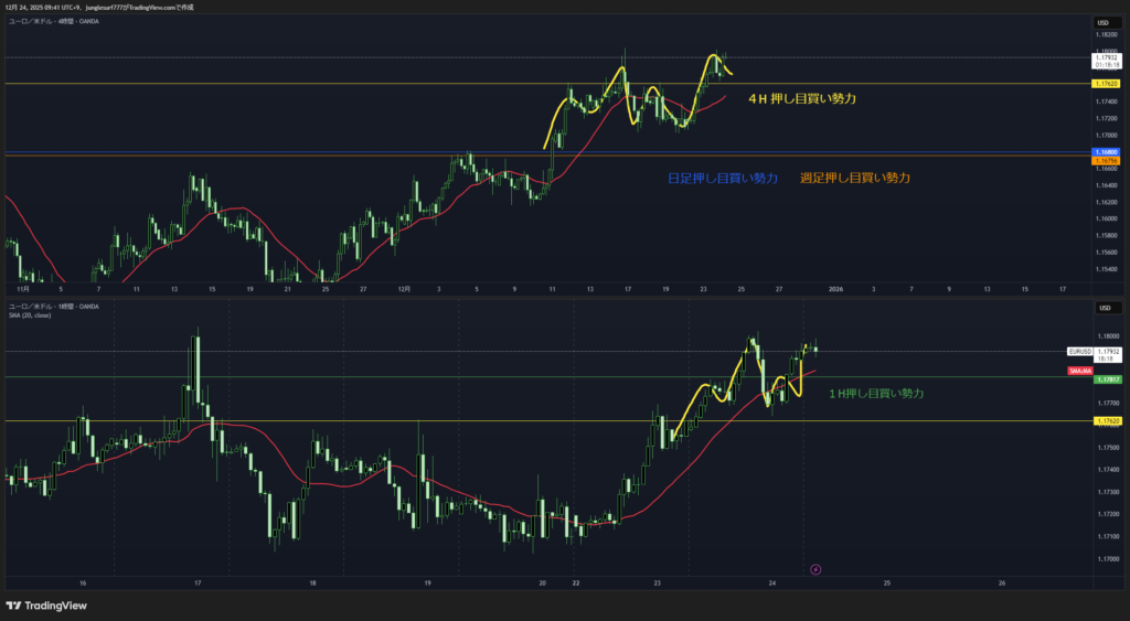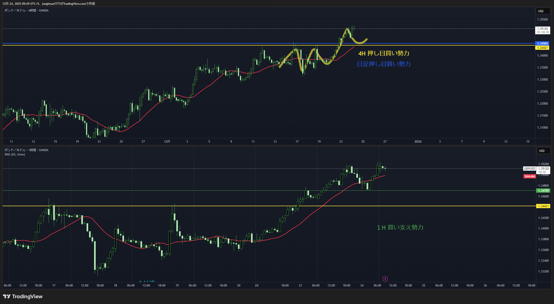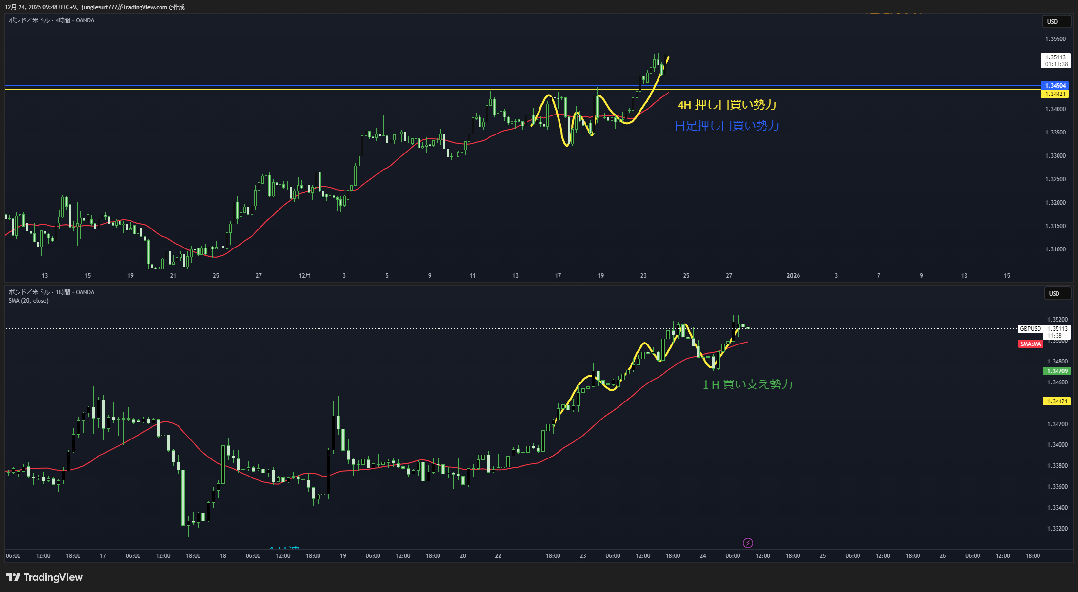 上昇の波の途中で、オレンジの水平線で押し目買いが入り易い。