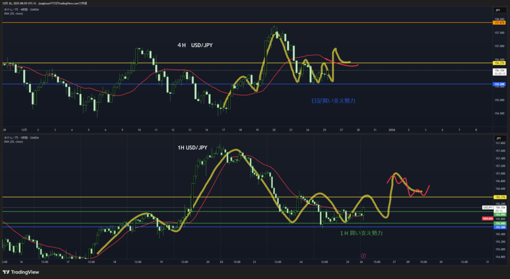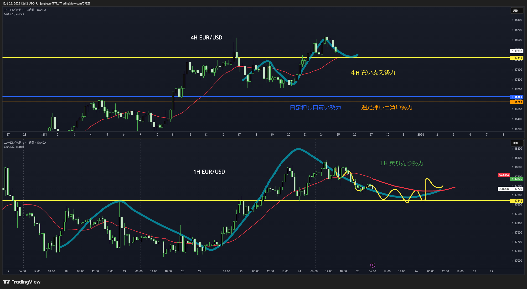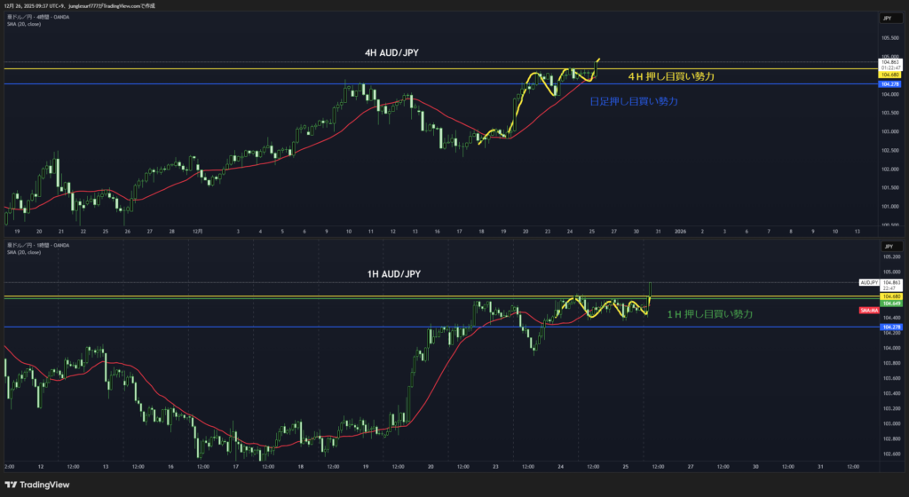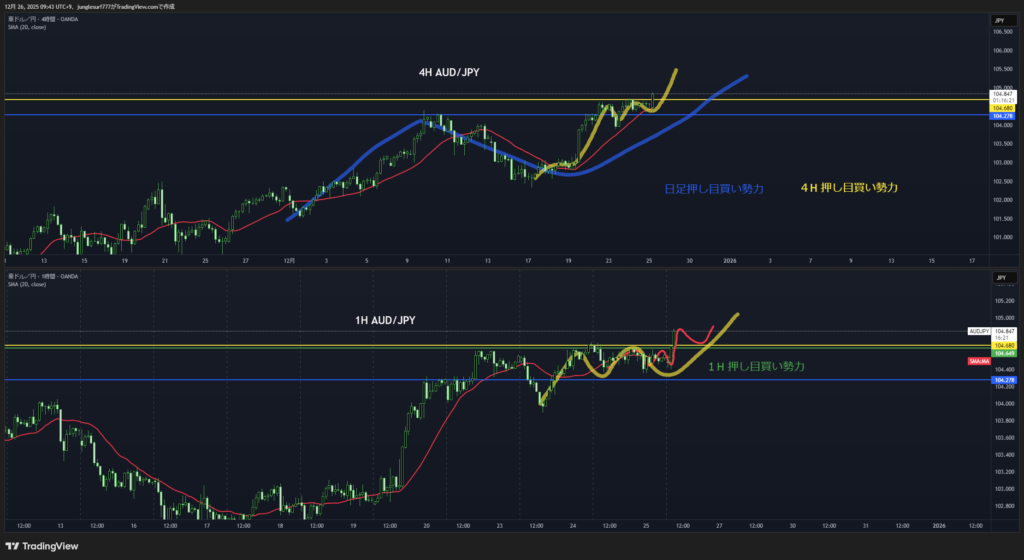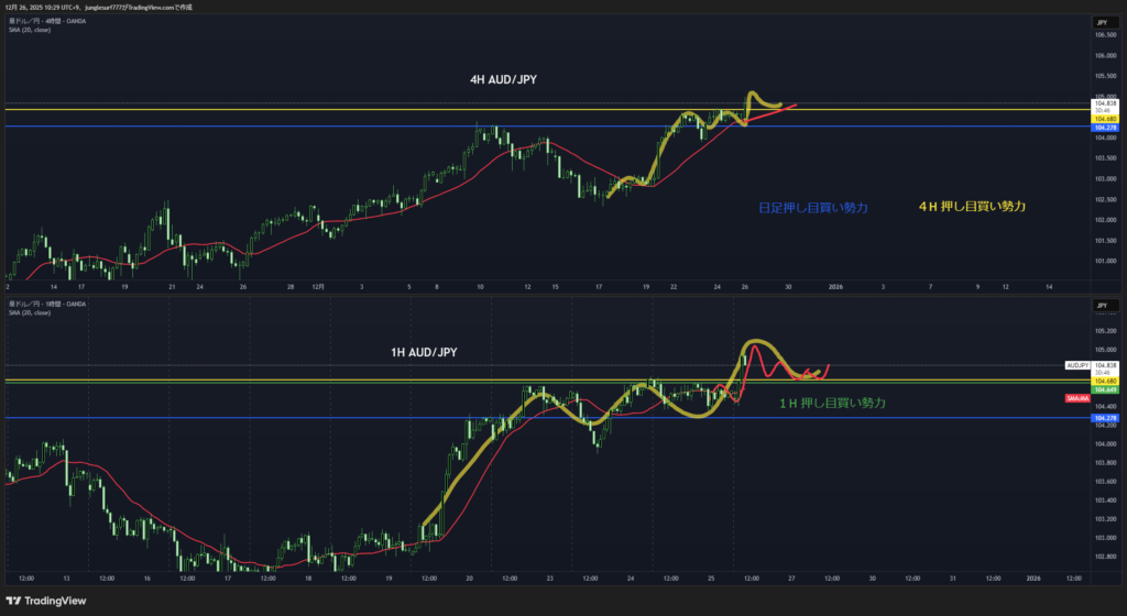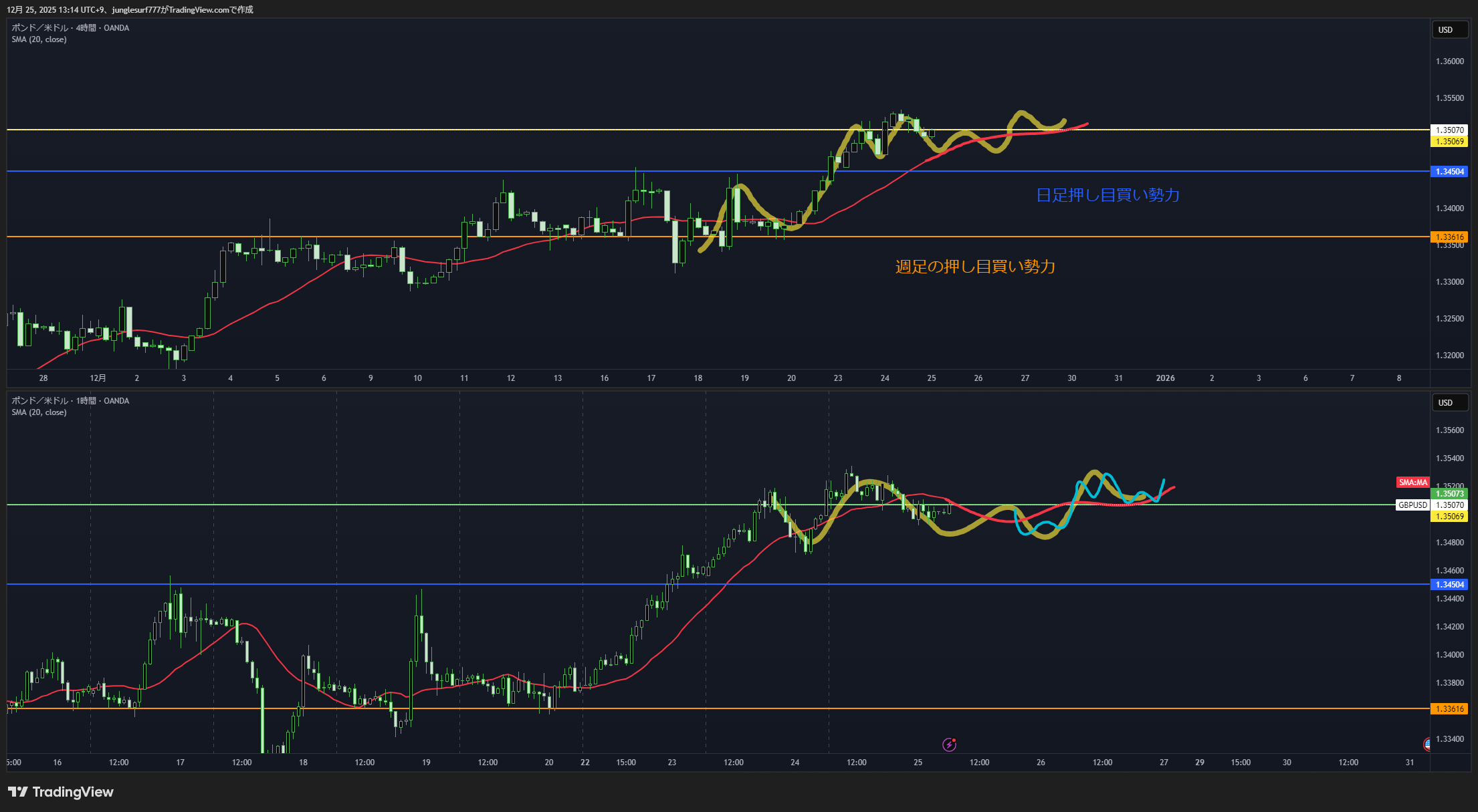 この局面で考えられる、一貫性にもとずいた優位性のあるトレードは下の4時間調整明けからの押し目買い。