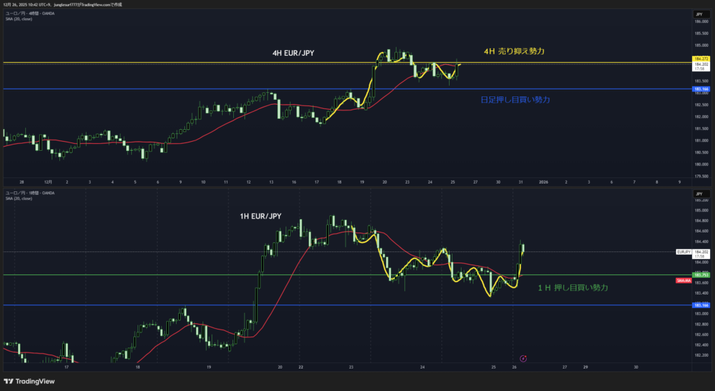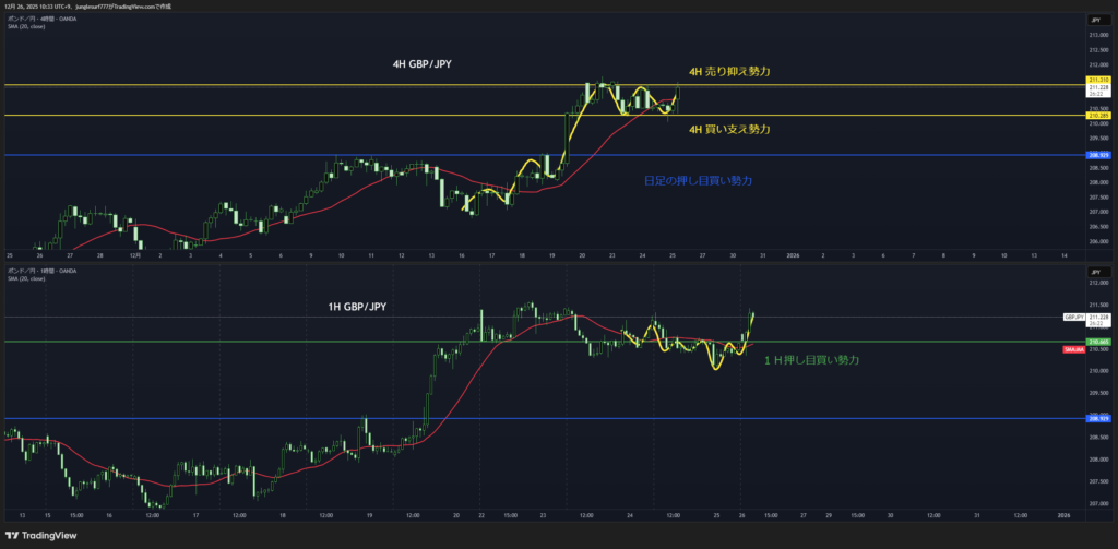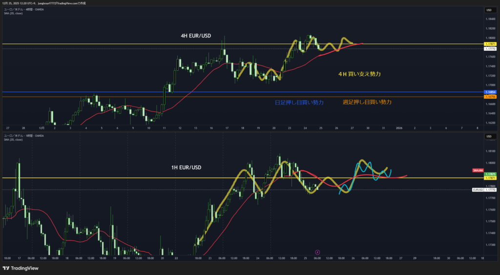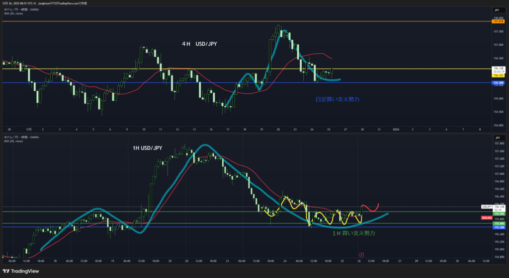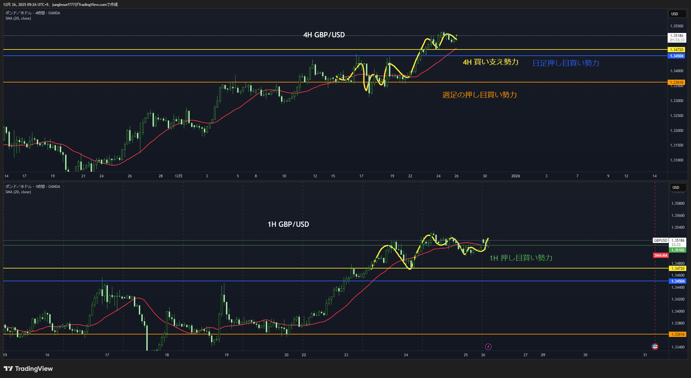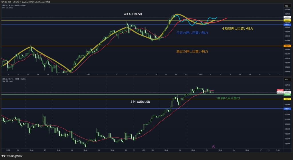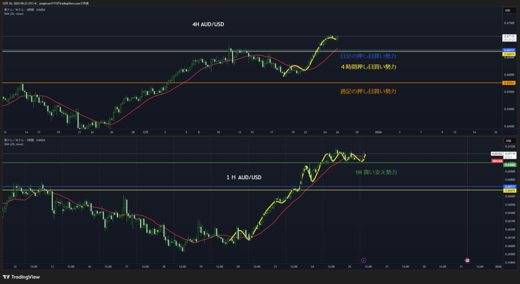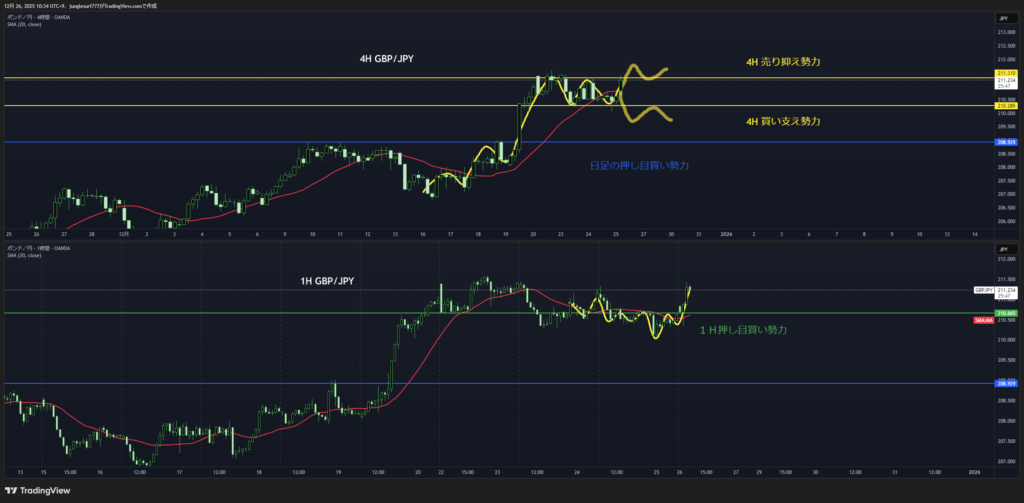 この局面で考えられる、一貫性にもとずいた優位性のあるトレードは下の4時間調整明けからの押し目買い。