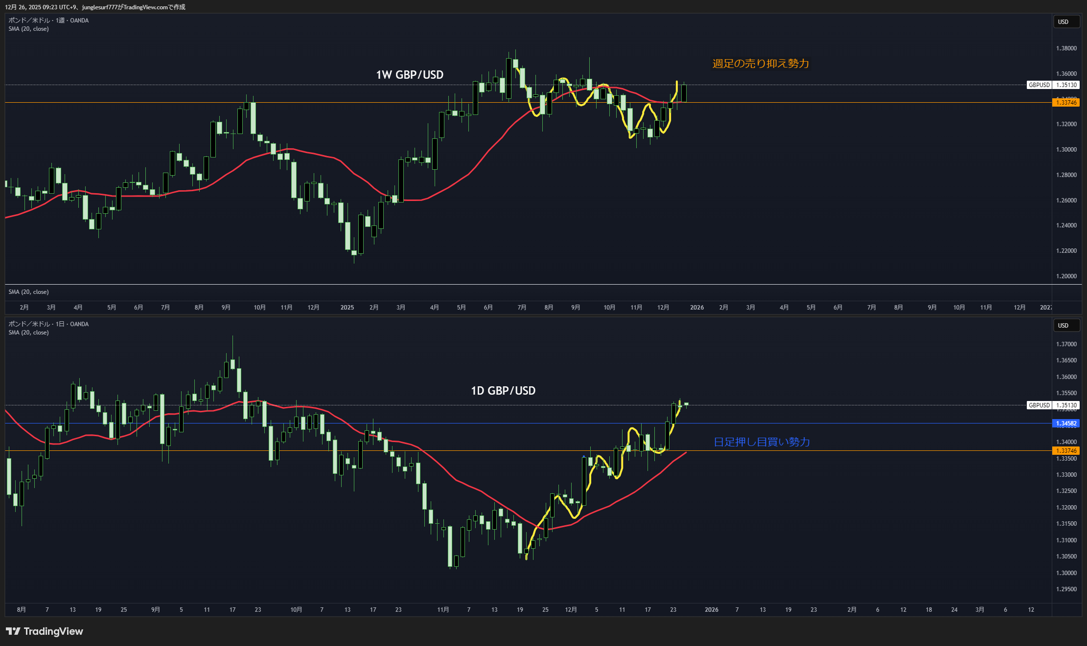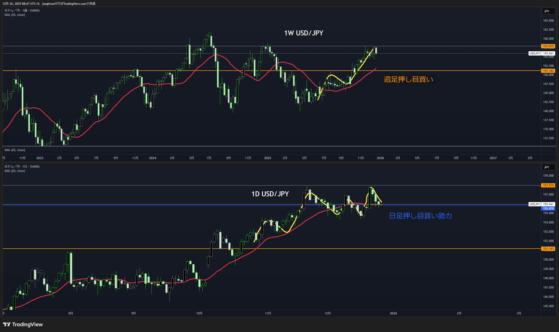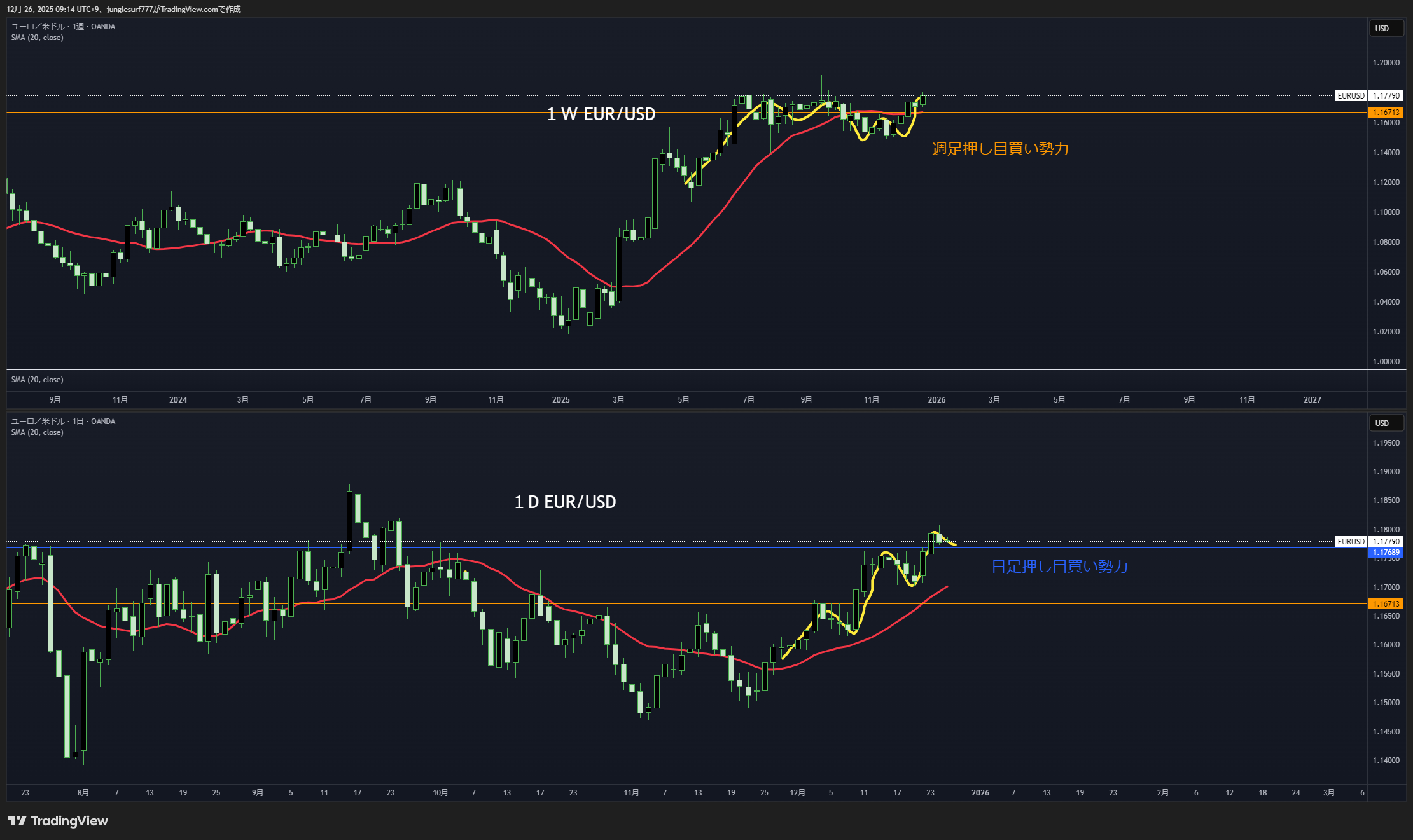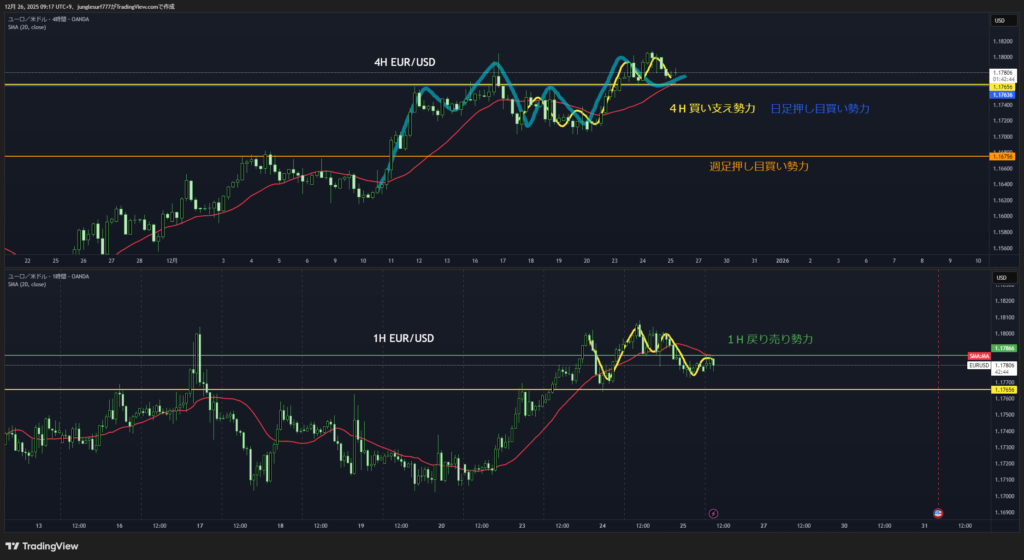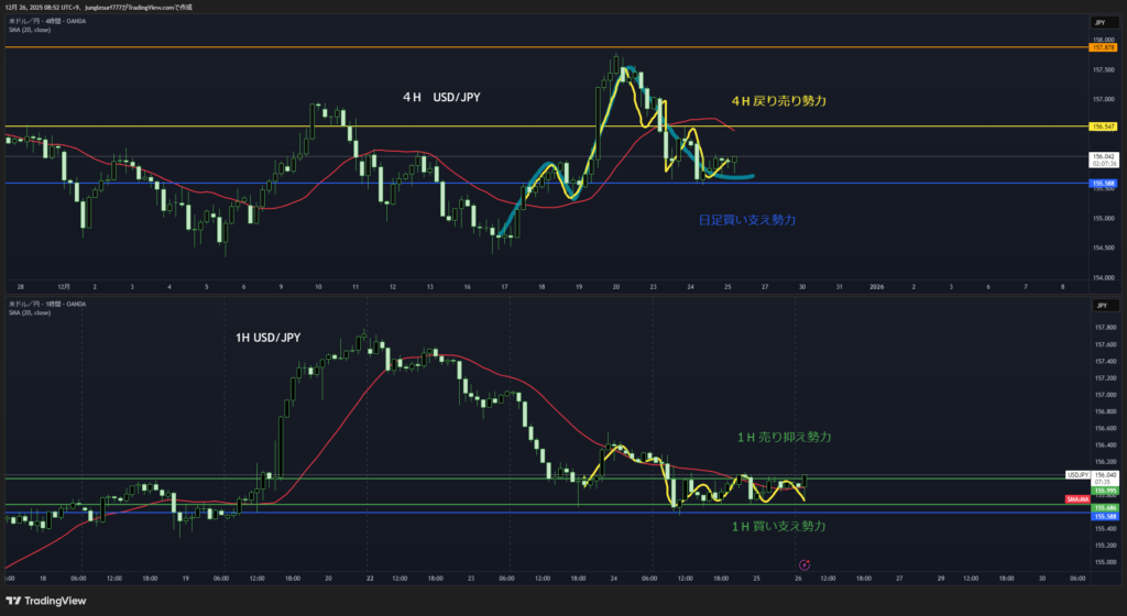 この局面で考えられる、一貫性にもとずいた優位性のあるトレードは下の4時間調整明けからの押し目買い。