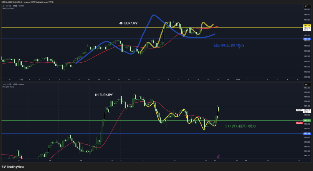 確かに日足の押し目買いエリアで、4時間の押し目買い