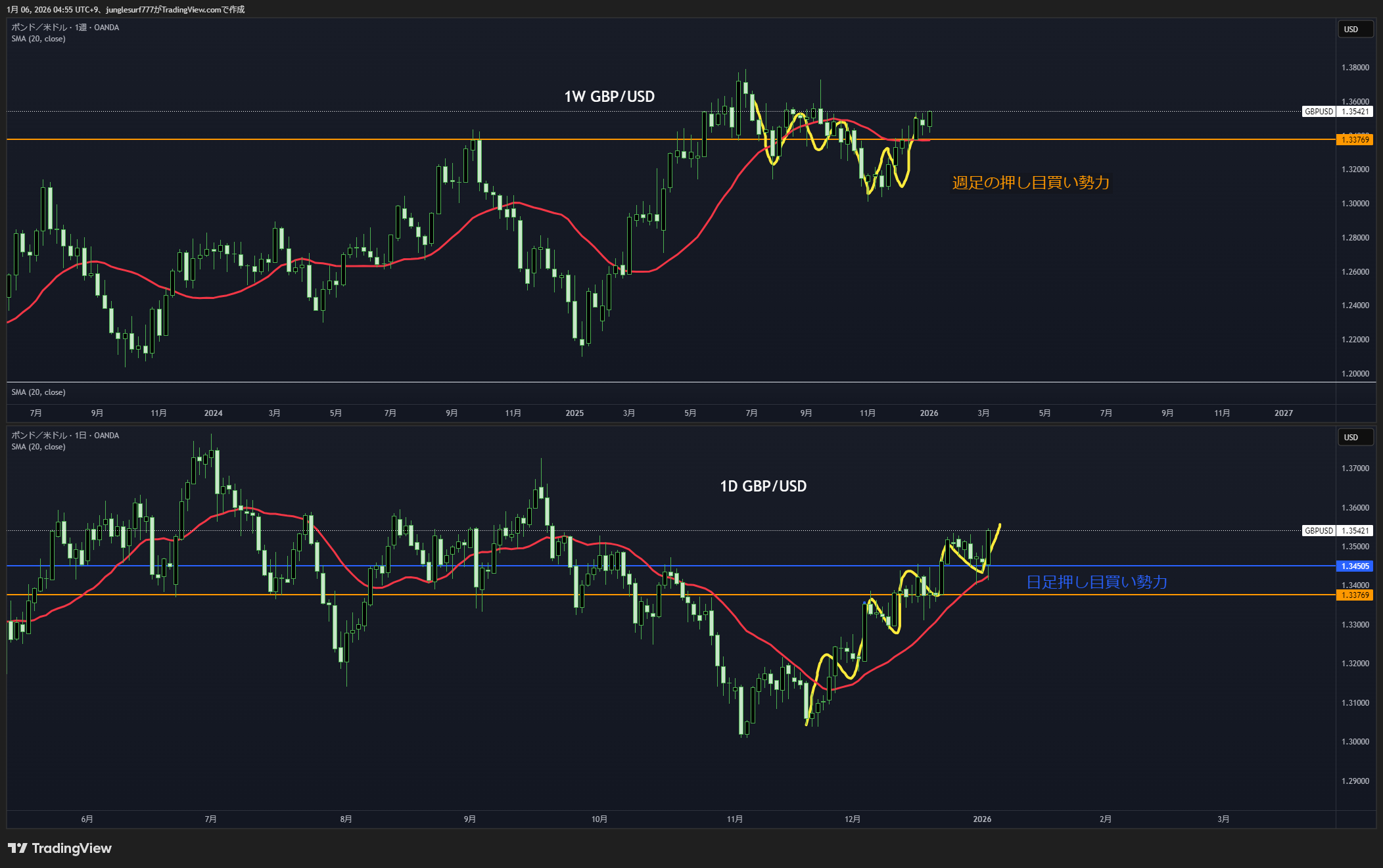 押しを付けている最中で、オレンジの水平線で押し目買いが入り易い。