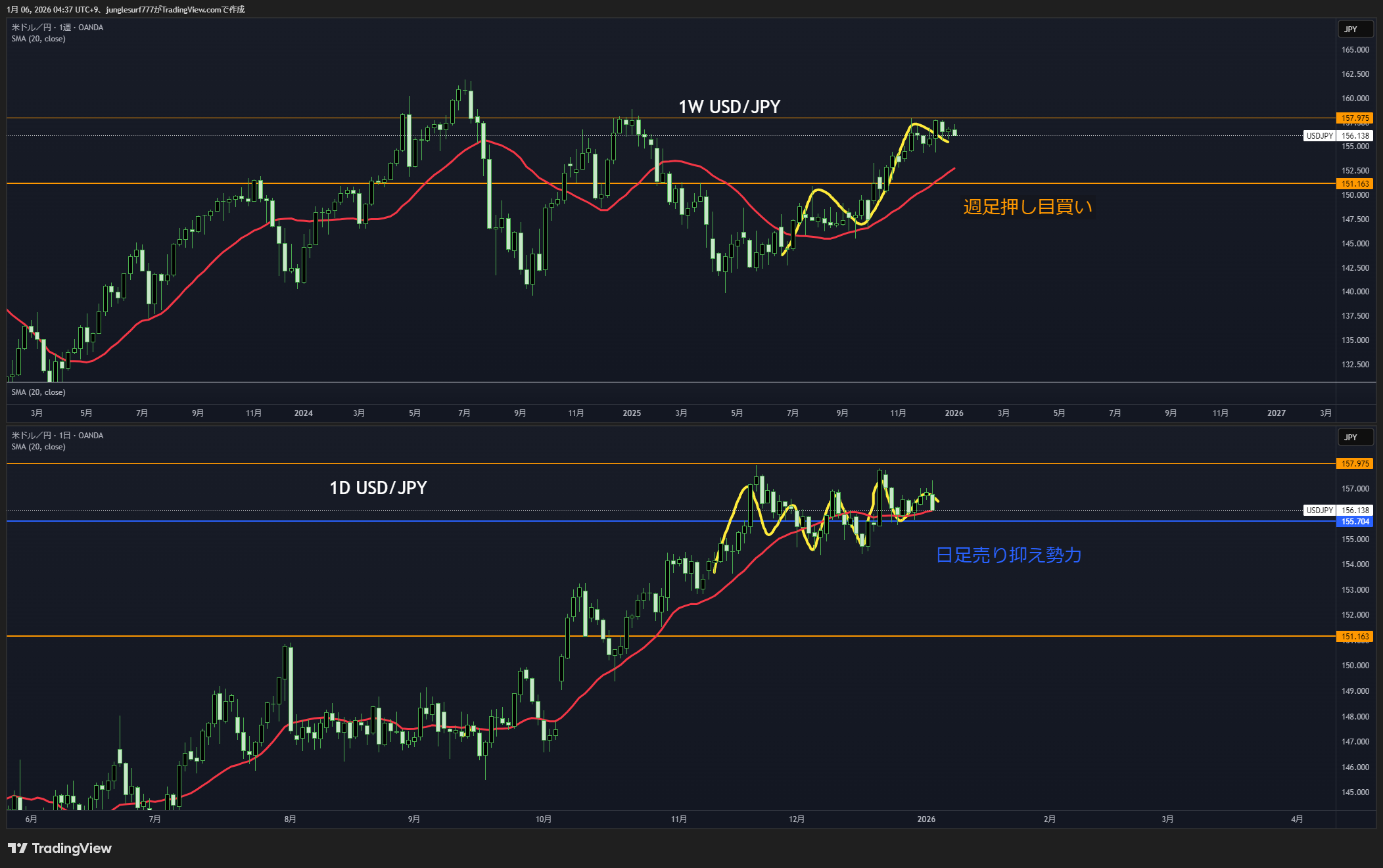 日足の買い支えと、週足押し目買い勢力によって、反発した。