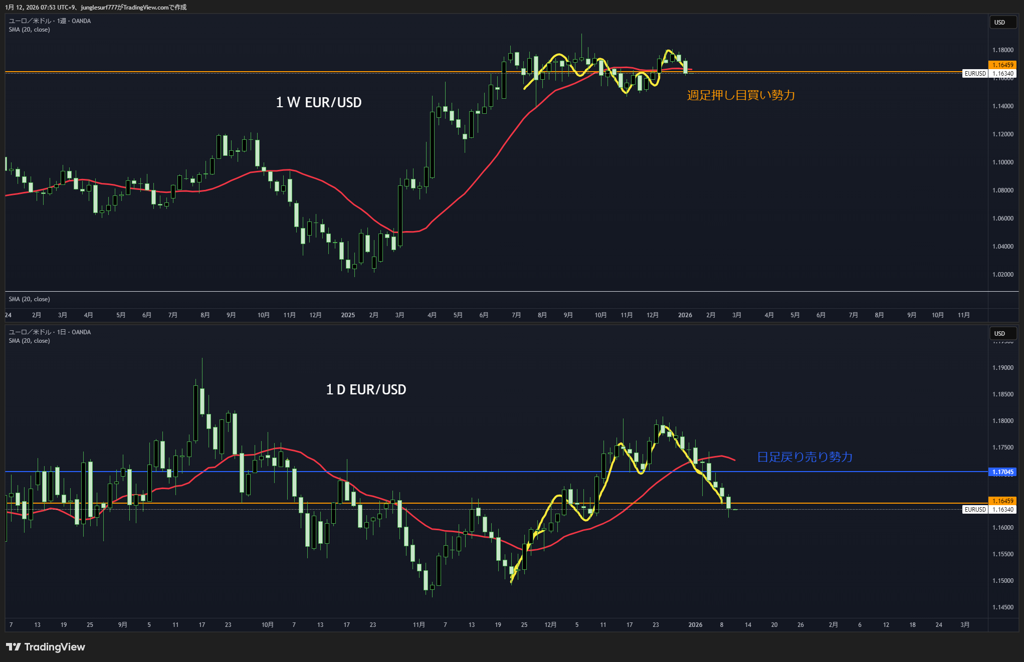 黄色の水平線で戻り売りが入りやすい
