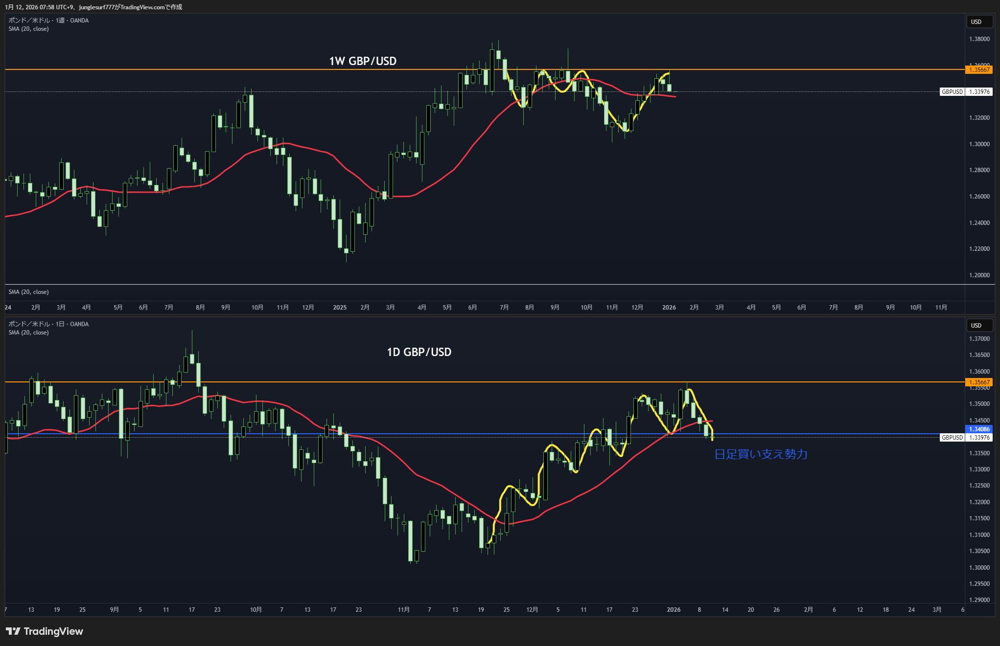 上昇の波の途中、オレンジの水平線で押し目買いが入った。