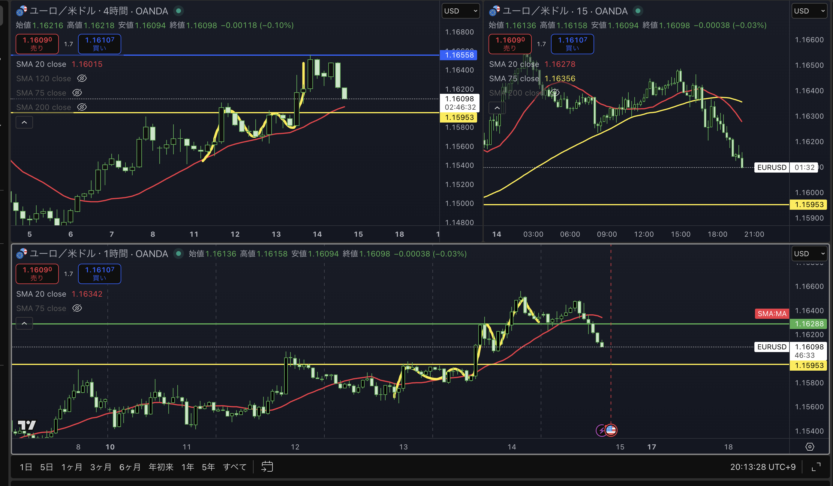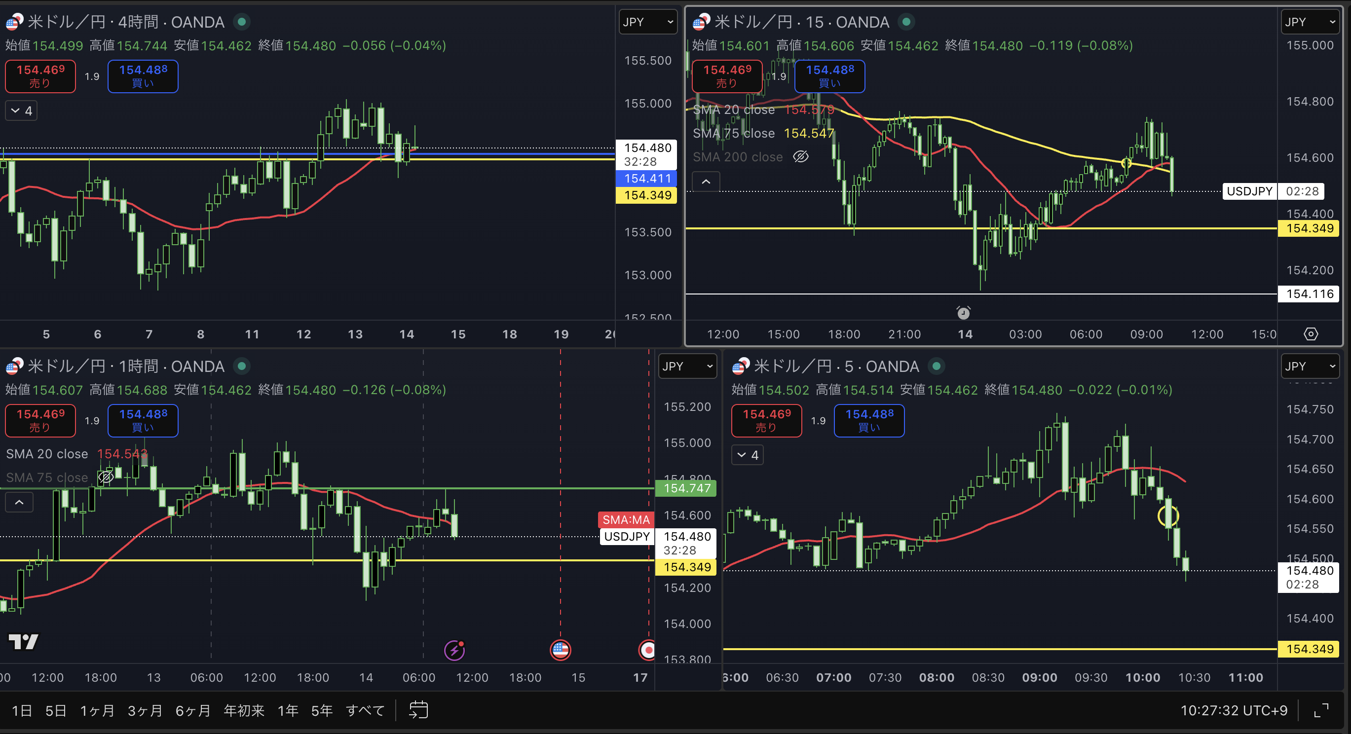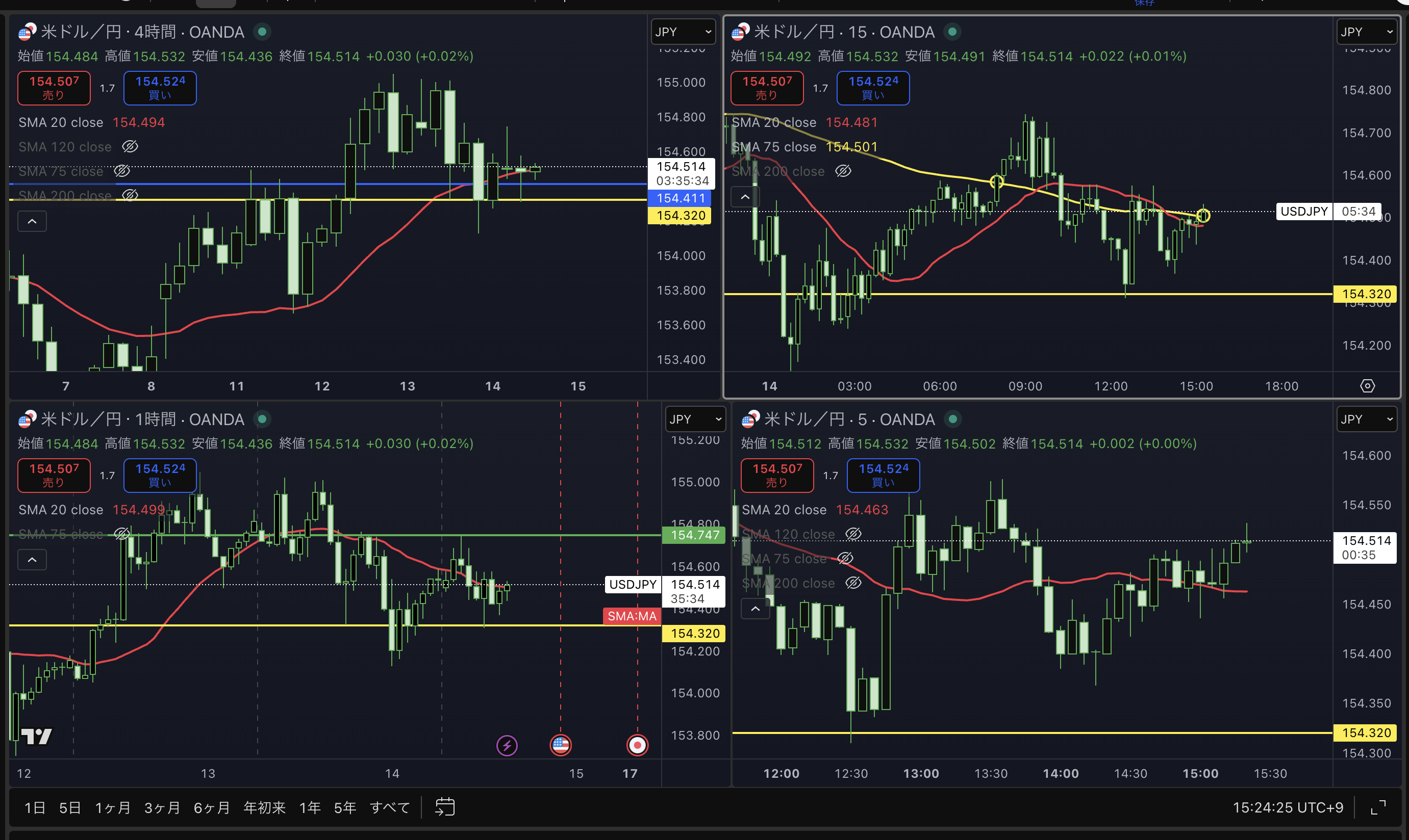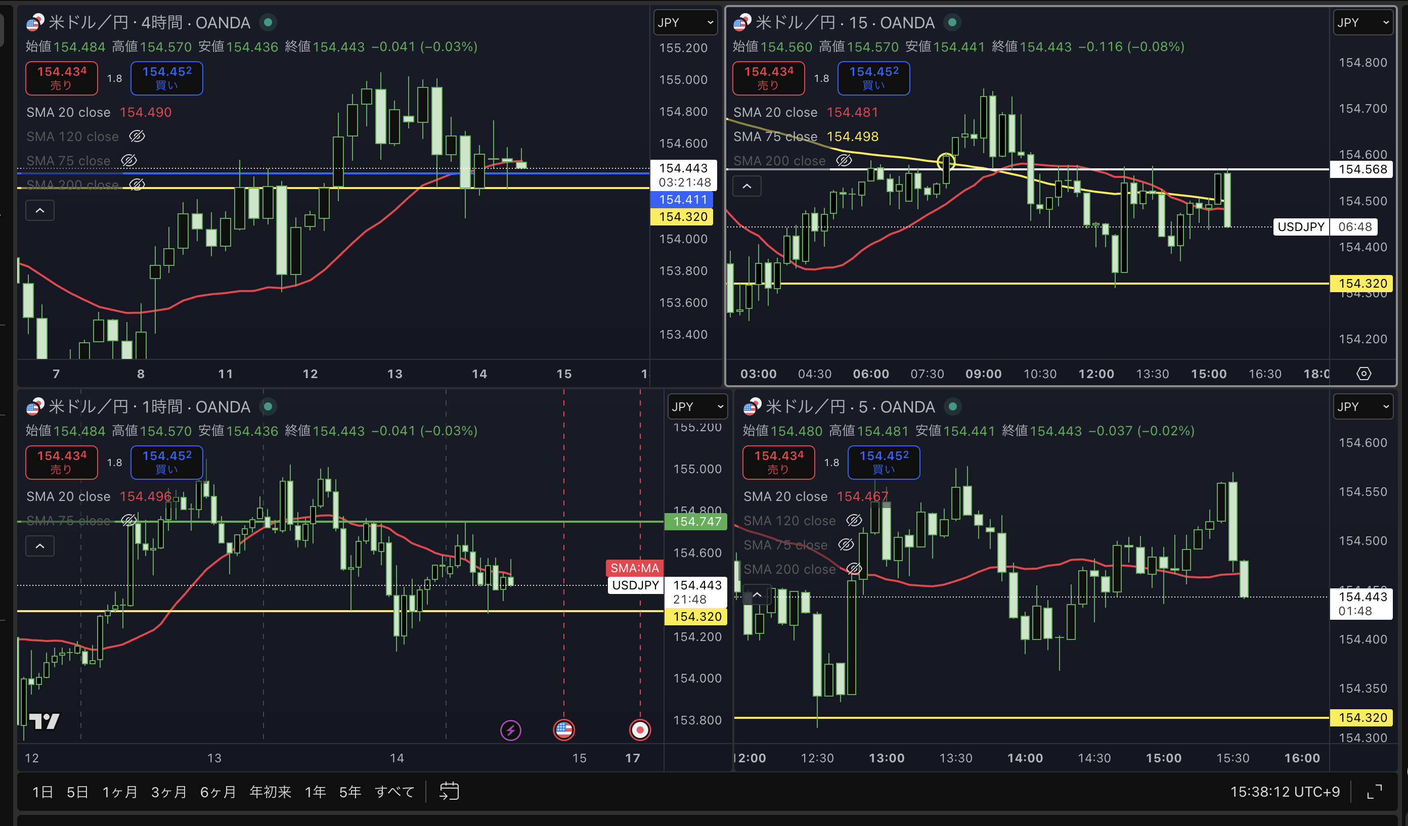 4時間足の波を狙って、1時間足の戻り売りして15分。高値越えでエントリー。