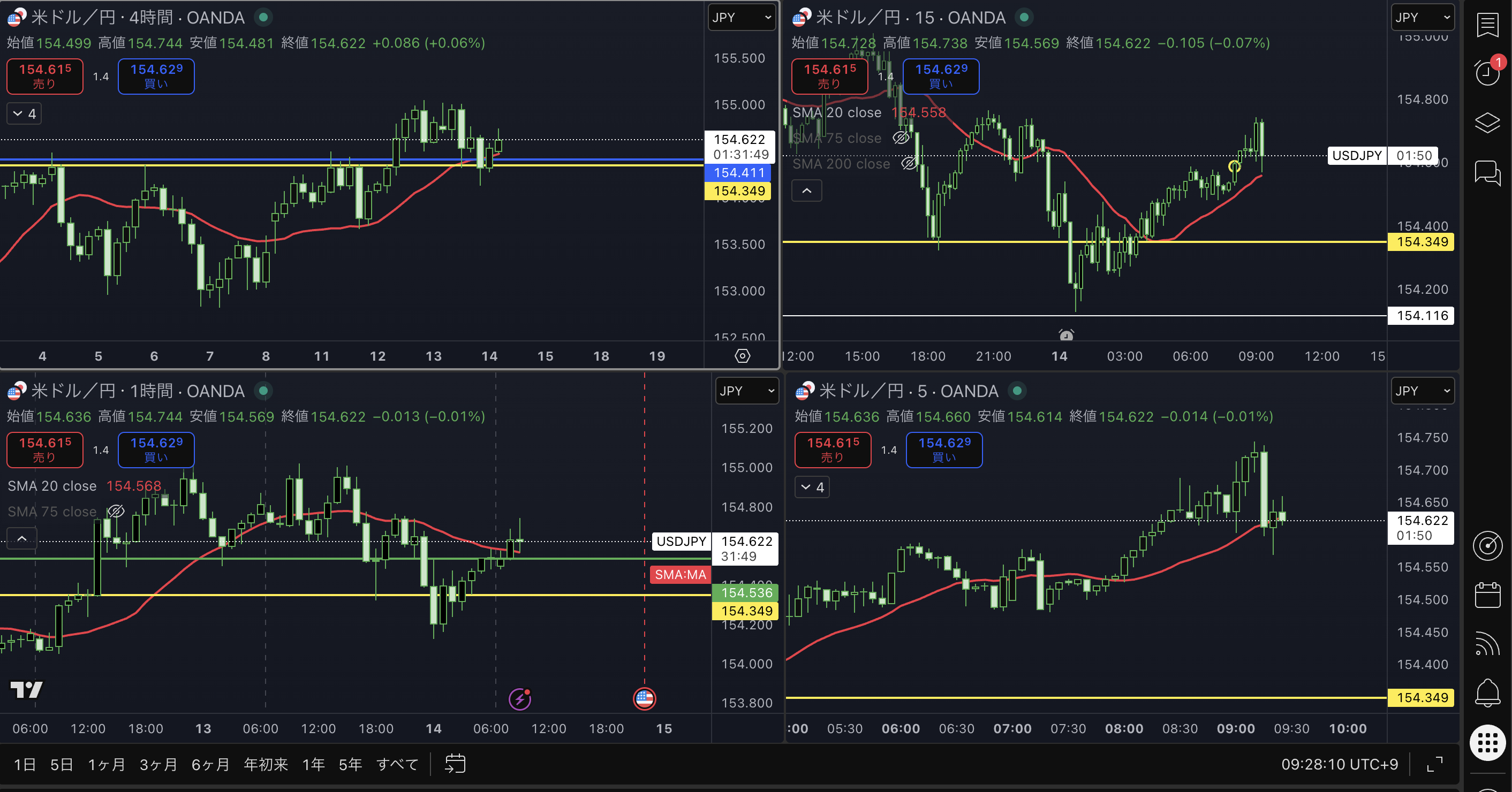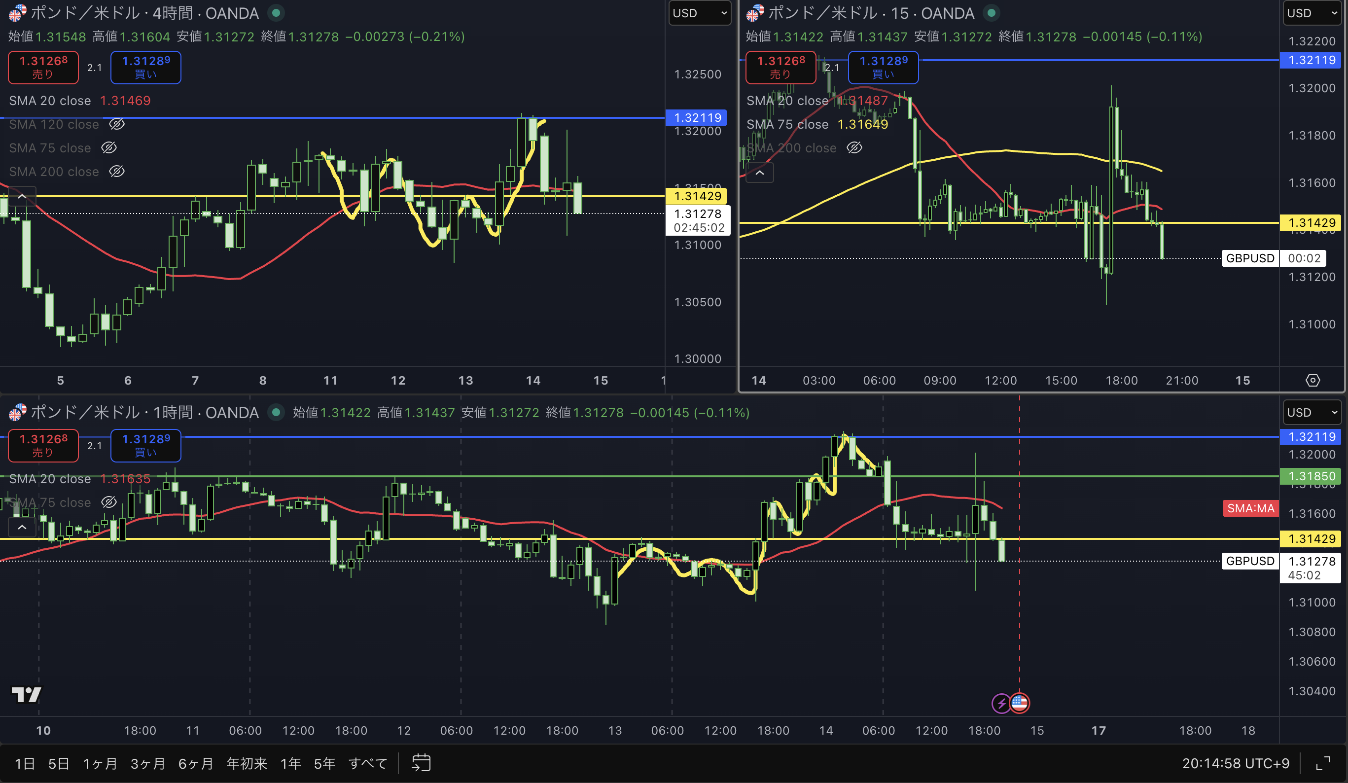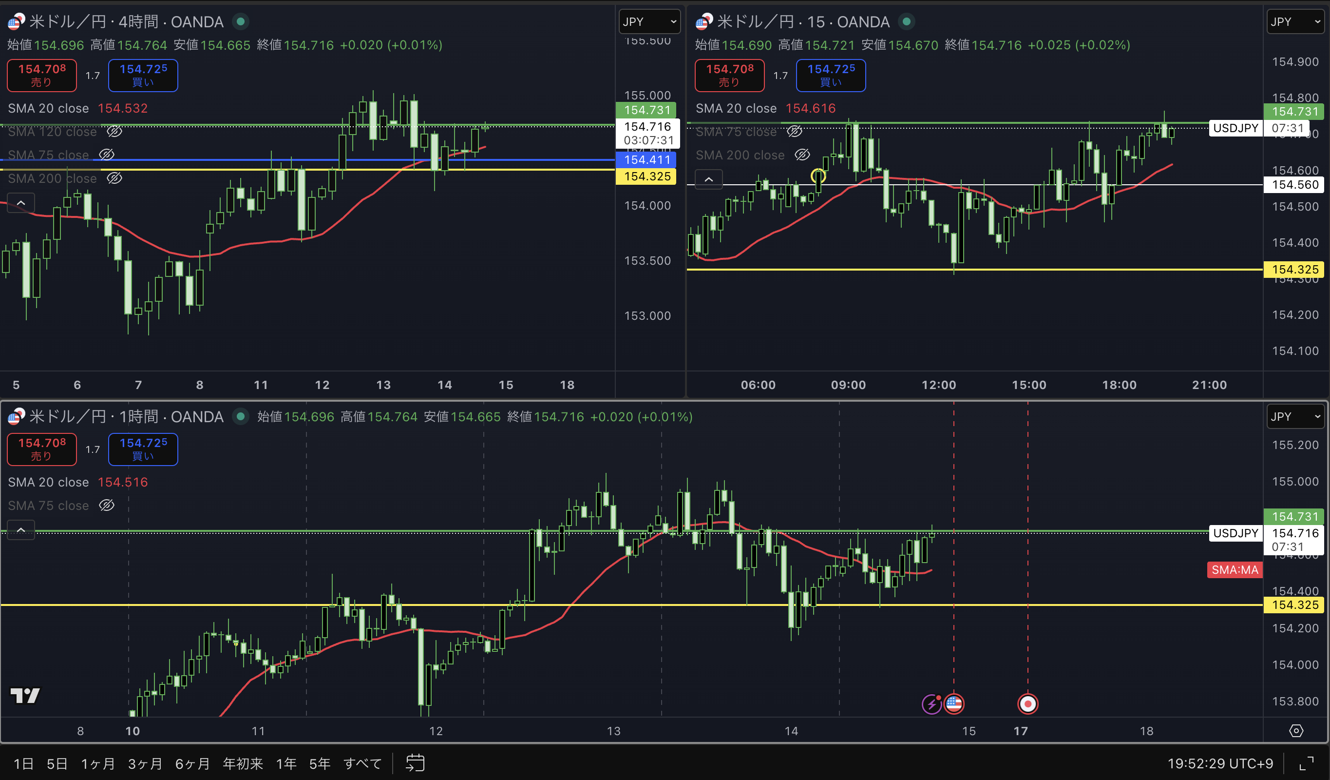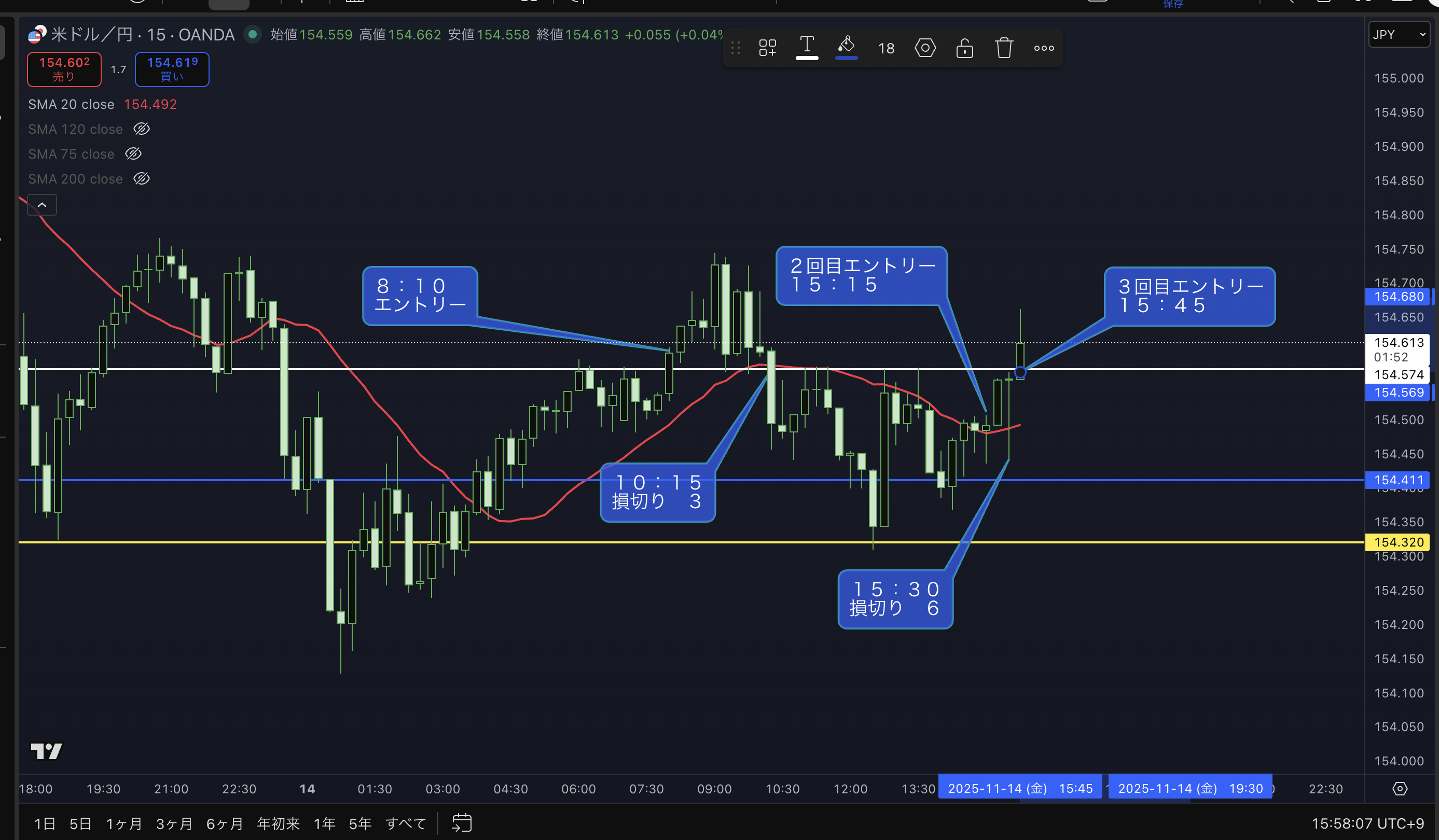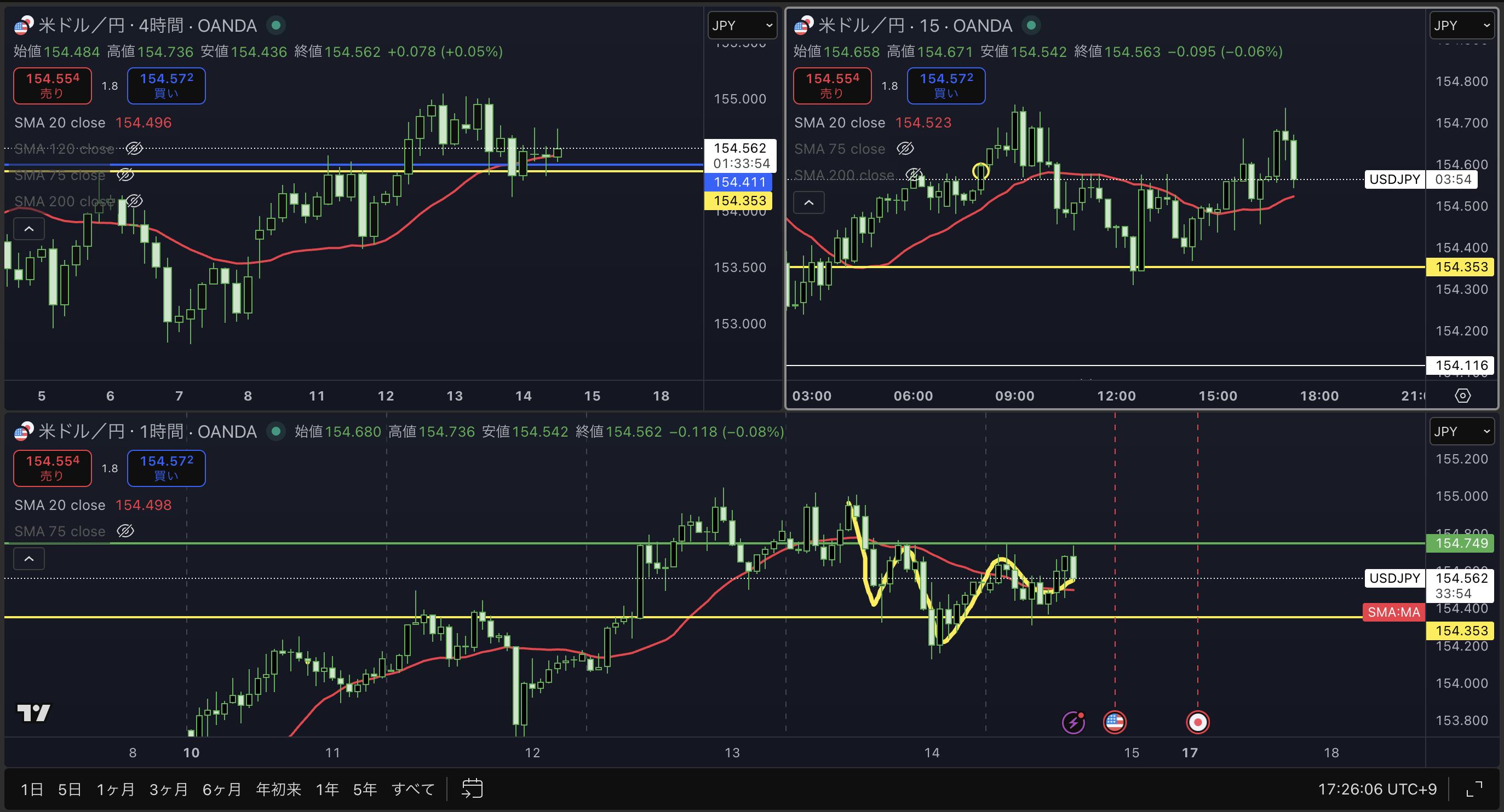 4時間足の波を狙って、1時間足の戻り売りして15分。高値越えでエントリー。