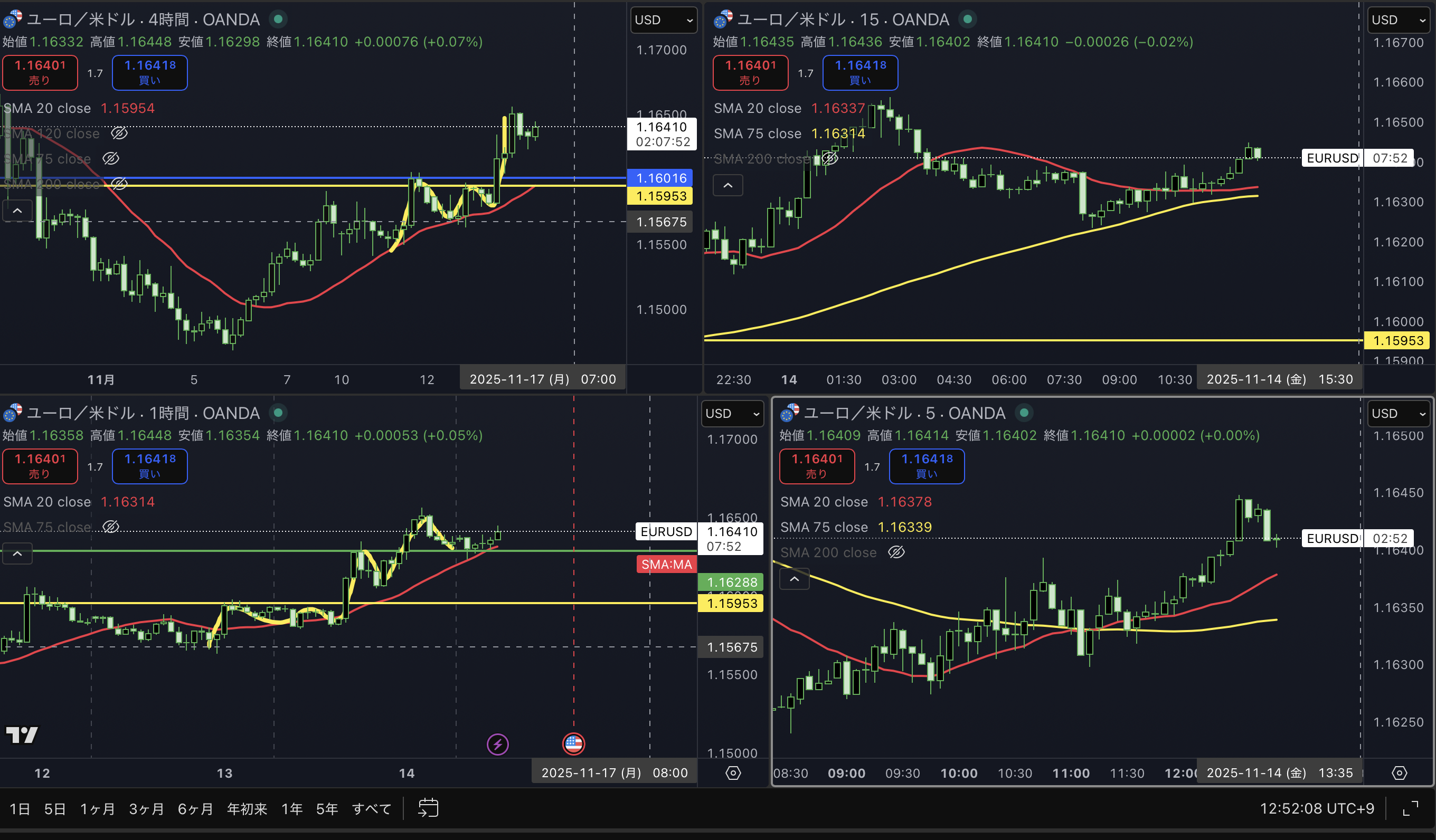 日足の波が継続しているので、4時間足の押し目買いを狙ってもいいが、優位性としては三角かな、トレンド転換シグナルの卵の可能性もあるし、4時間足実体収納でまだ上と見ている勢力もあるので、1時間の動き次第でまだ4時間の波が出る可能性はある。1時間のこの下落がどこで終わるのかを見極めて、1時間の移動平均線などの兼ね合いも見てチャンスがあれば入っていきたい。