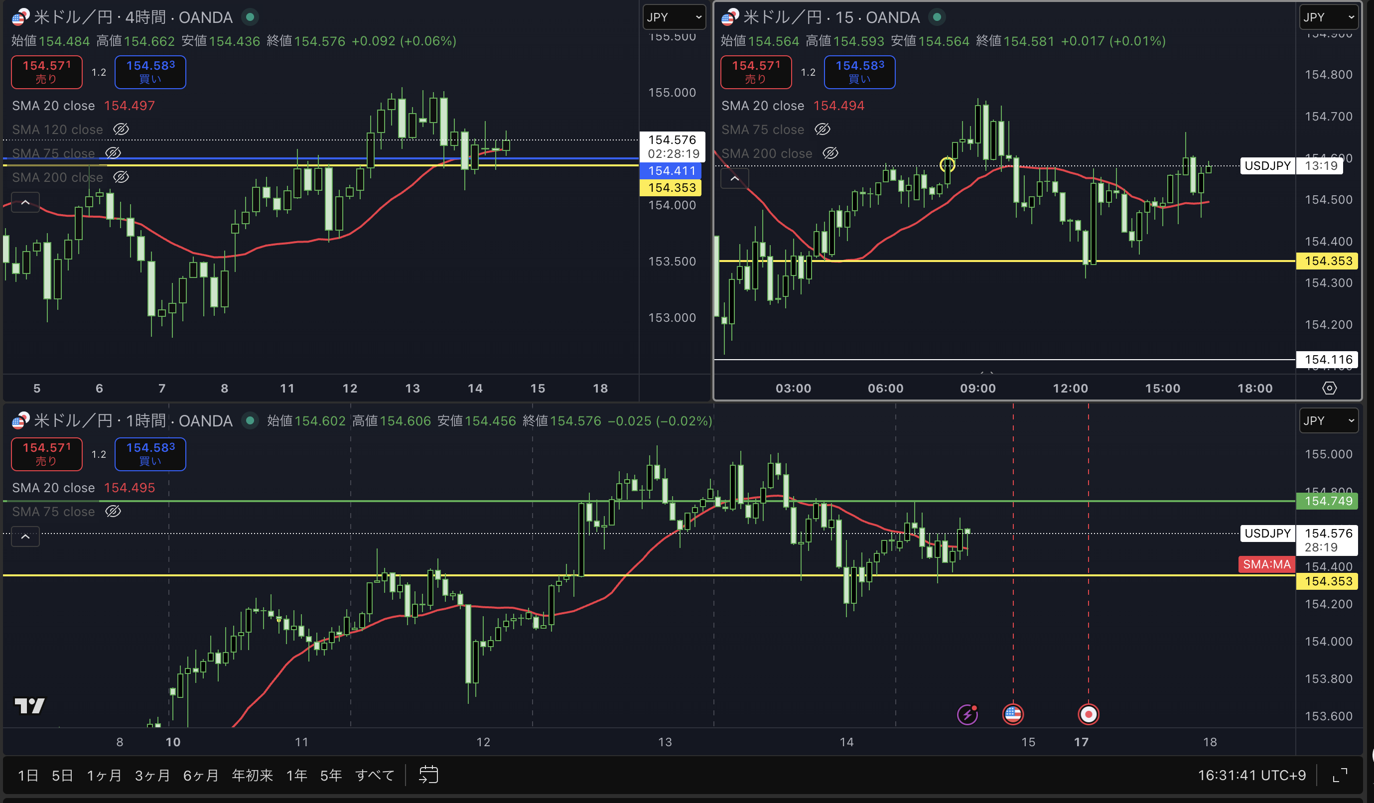 黄色の水平線まで戻ってくれば4時間の押し目買いを検討する。