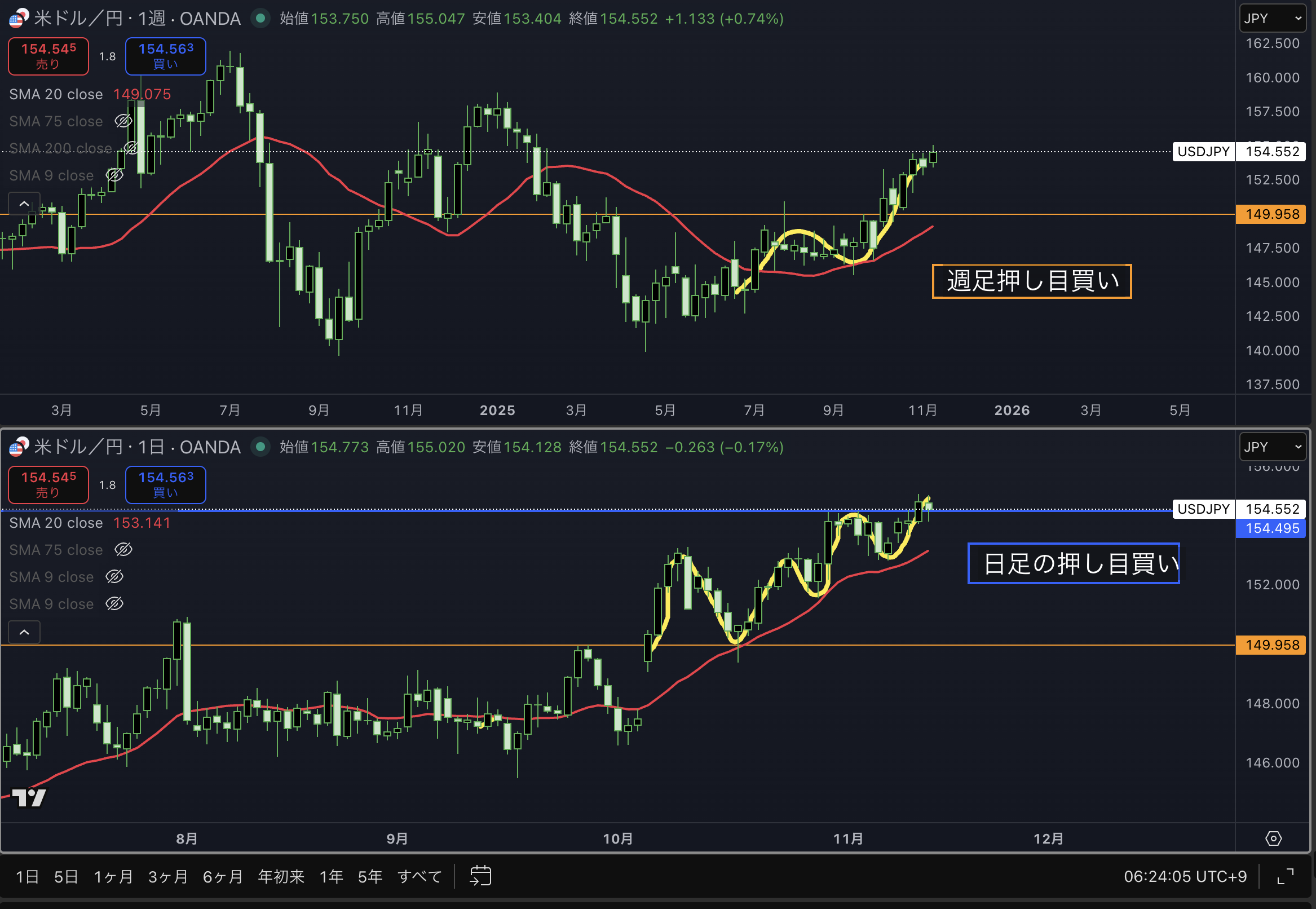 押し目を付けていて黄色の水平線で押し目買いが入り易い