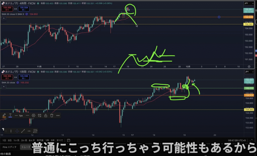 昨日のポイントは優位性があまり高くないリスクが高まるポイントであった。なぜなら4時間前回高値付近で、テクニカルが出ていたから、エントリーポイントが来たからといってすべて入るわけではない。そのテクニカルが波のどこで起こっているかが、1番重要で4時間の押し目買いの1時間の押し目がいだけでは言語が不自由で、しっかりとリスクリワードを考えることが重要。存在確認から離れすぎていてリスクリワードが合わないポイントだった。そのようなポイントでエントリーを繰り返すと、波が出たり出なかったりして、勝ったり負けたりを繰り返すことになる。 もう少し落ち着いて焦らずに、エントリーポイントが来たら、テクニカルが出たら、すべて入らなければ思考に変えていく。