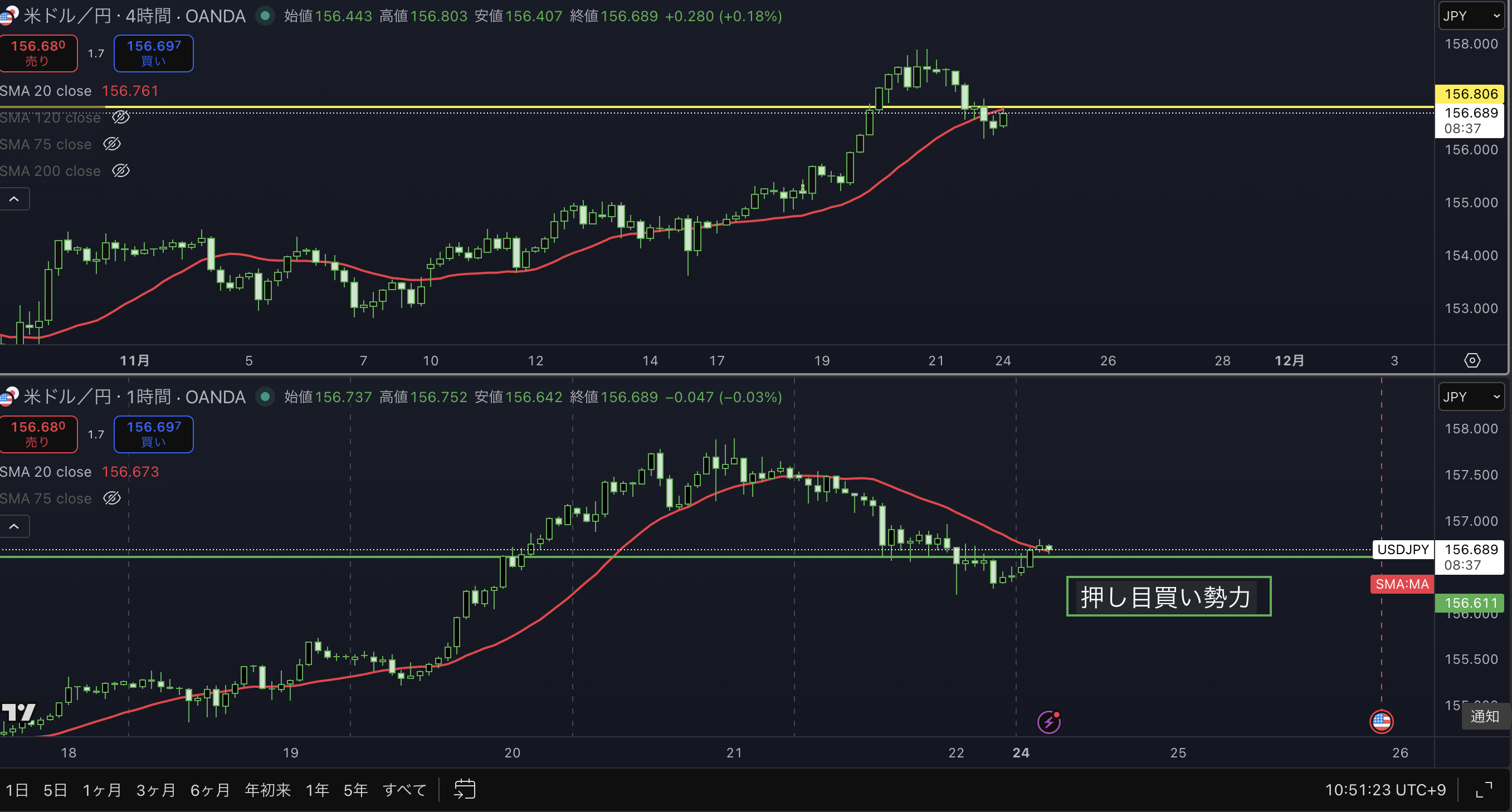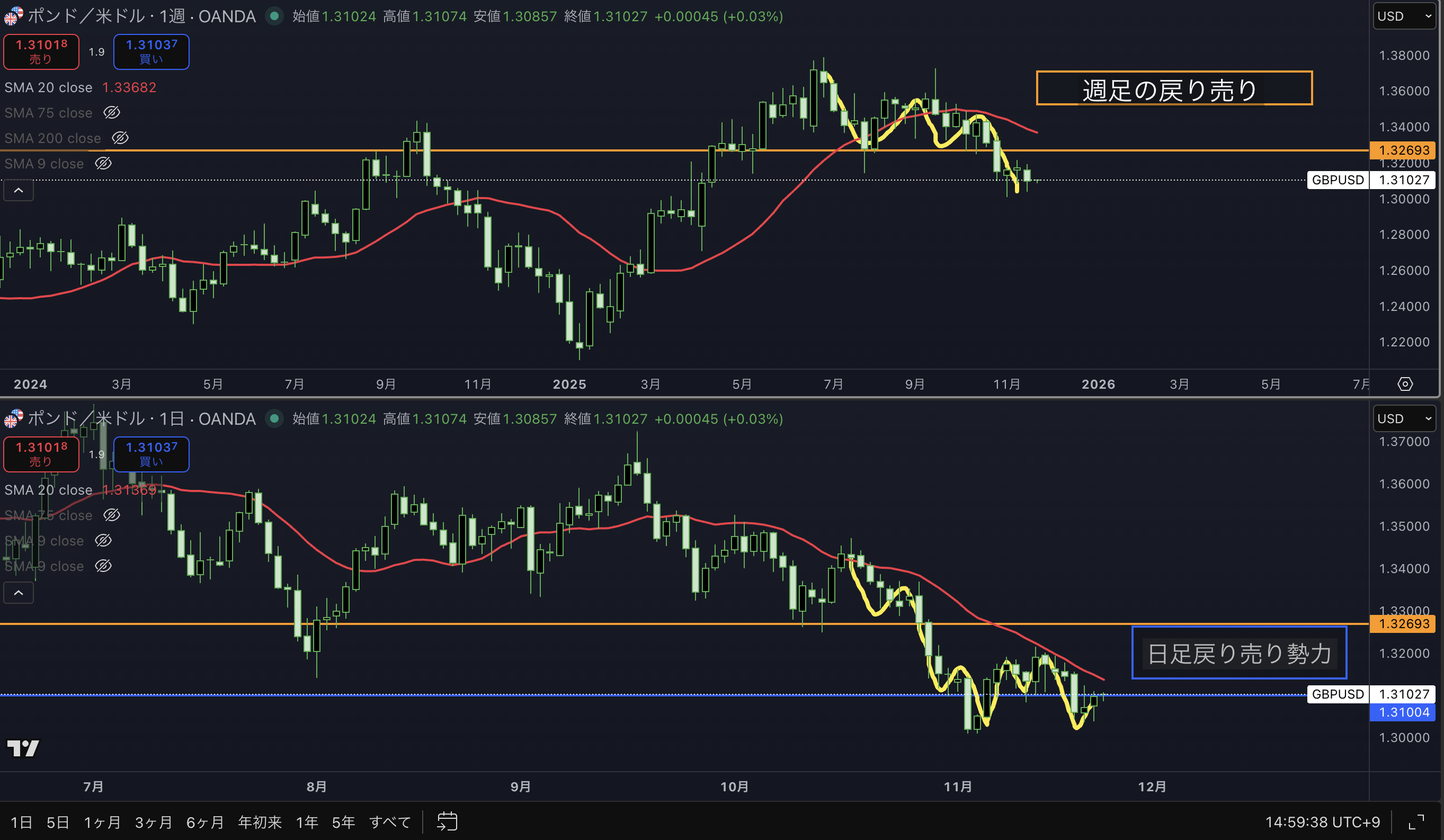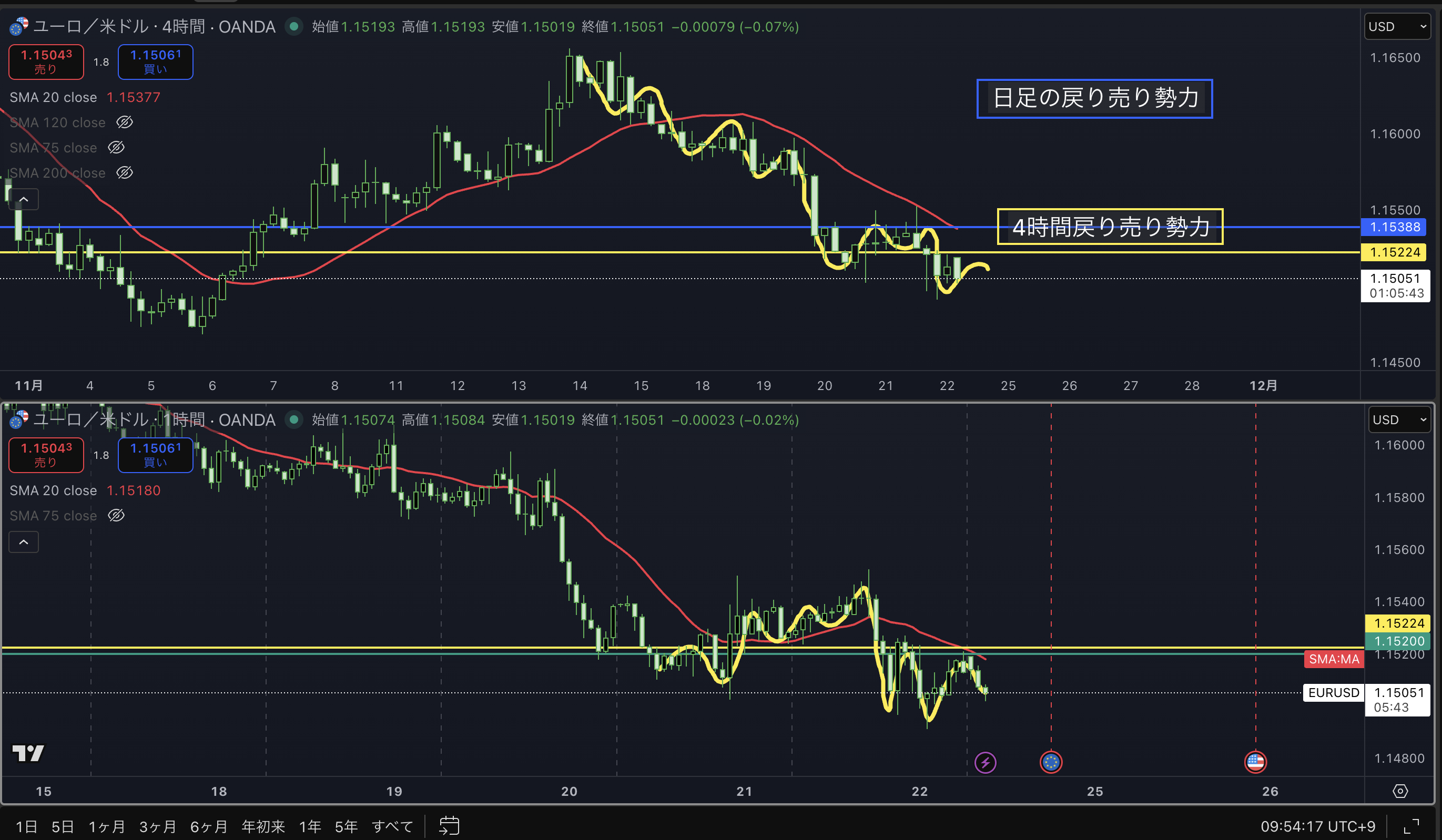 日足戻り売りエリアだが、4時間全戻しなので一旦4時間の押し目買いをやり過ごす必要がある。