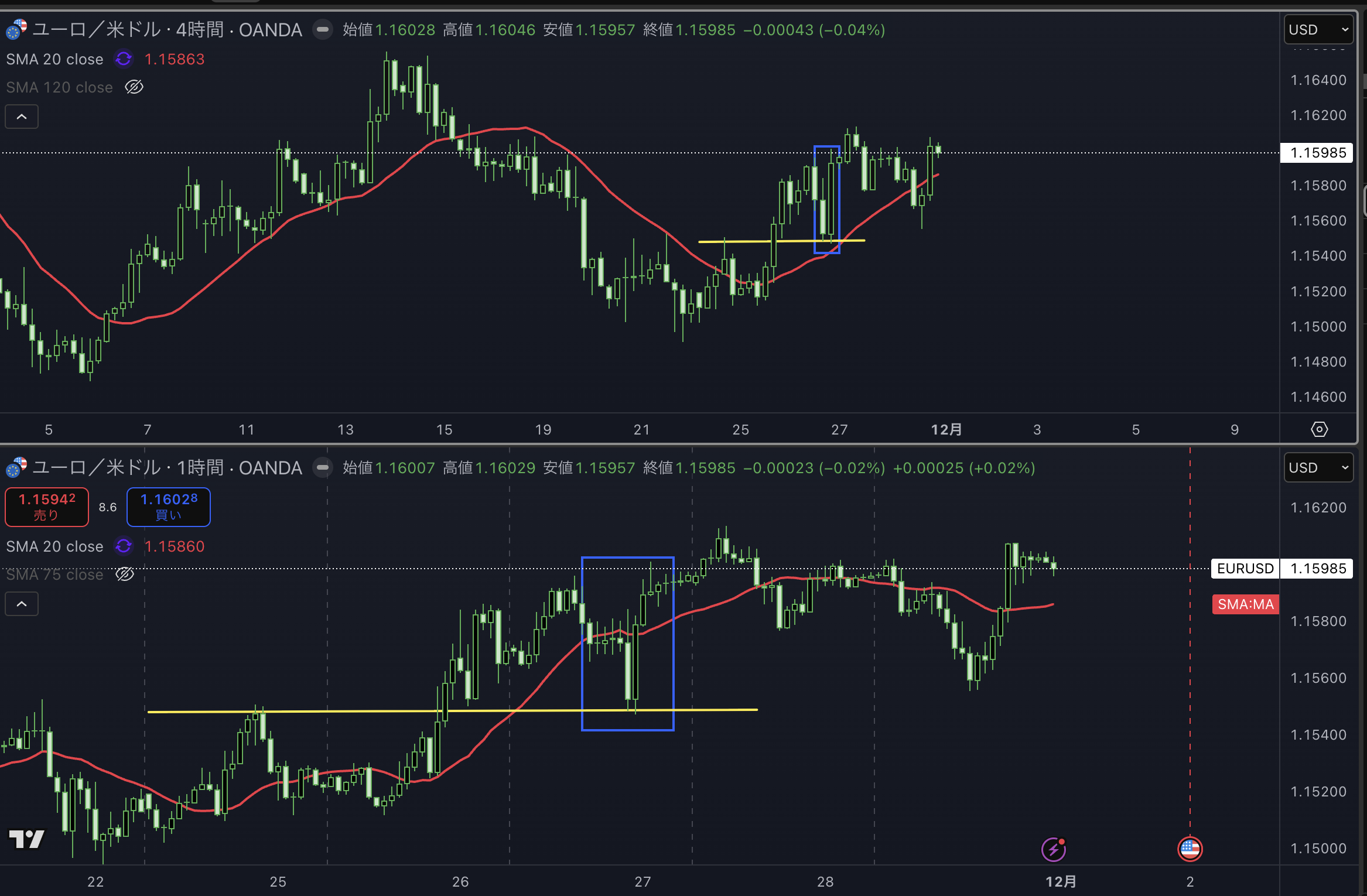 青枠で4時間の押し目買いを狙っていたが、足速くに行ってしまったので取れなかった。