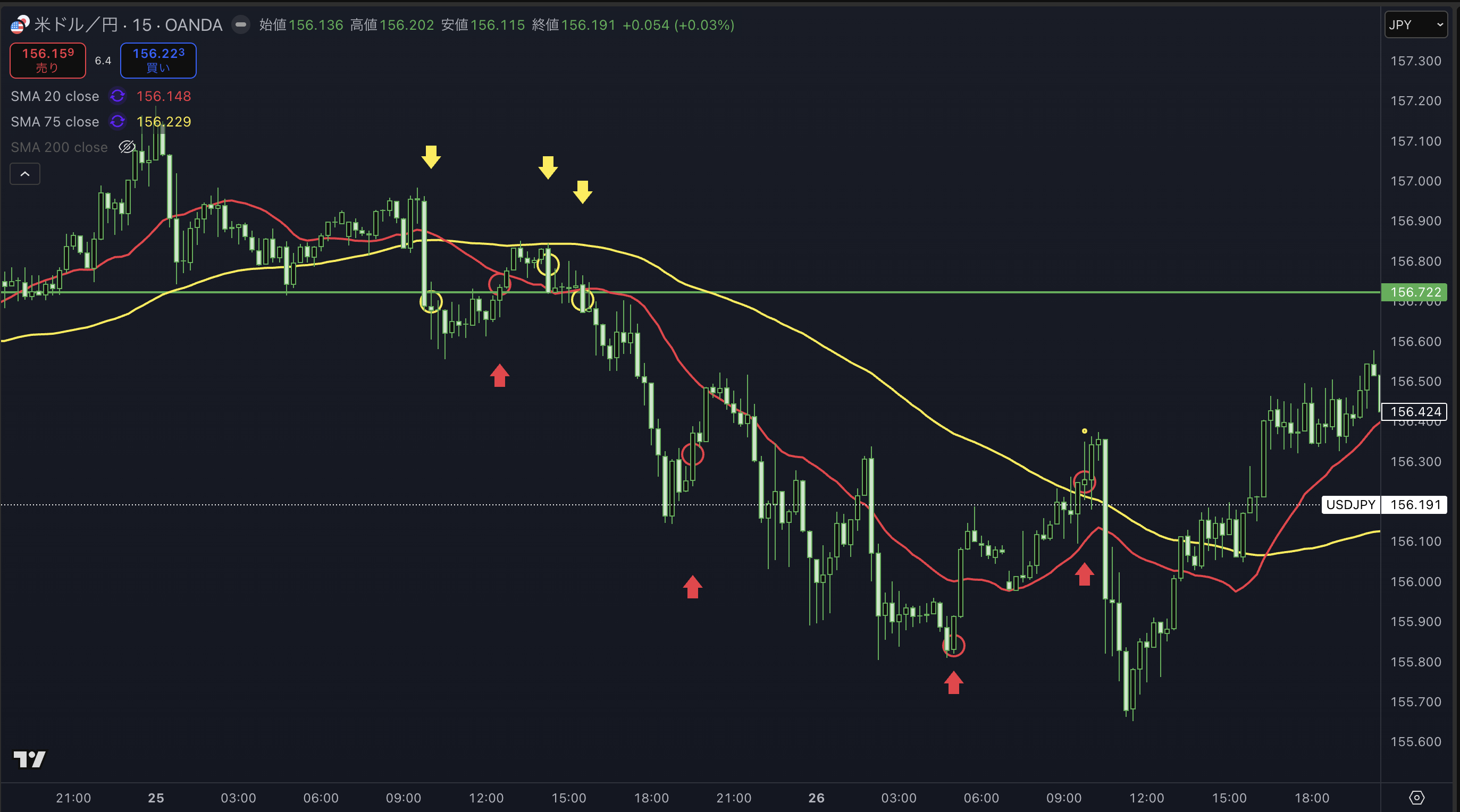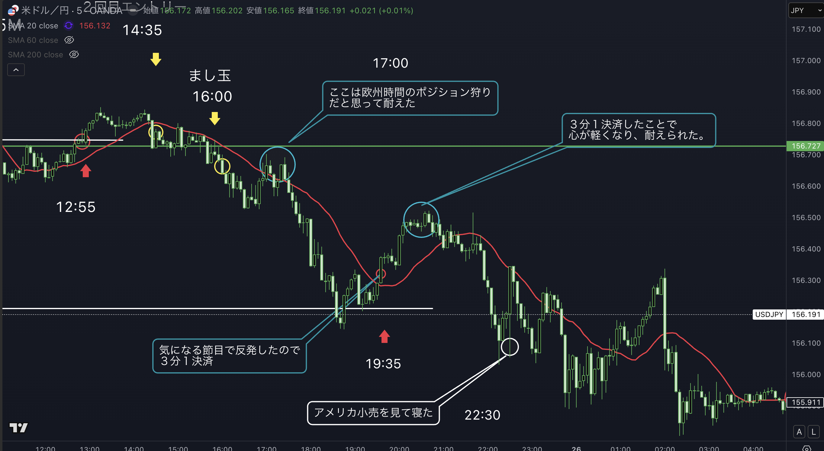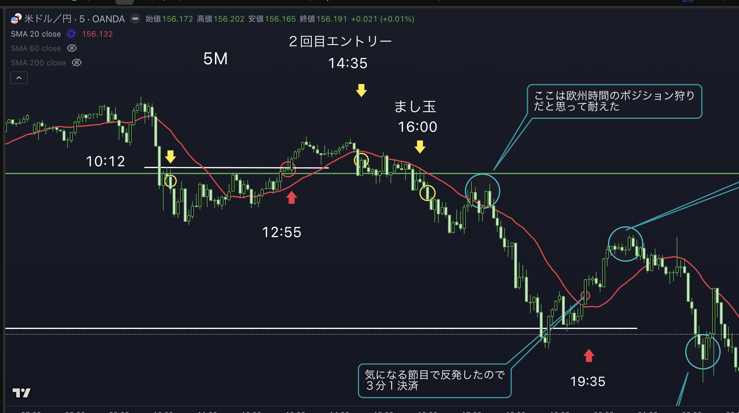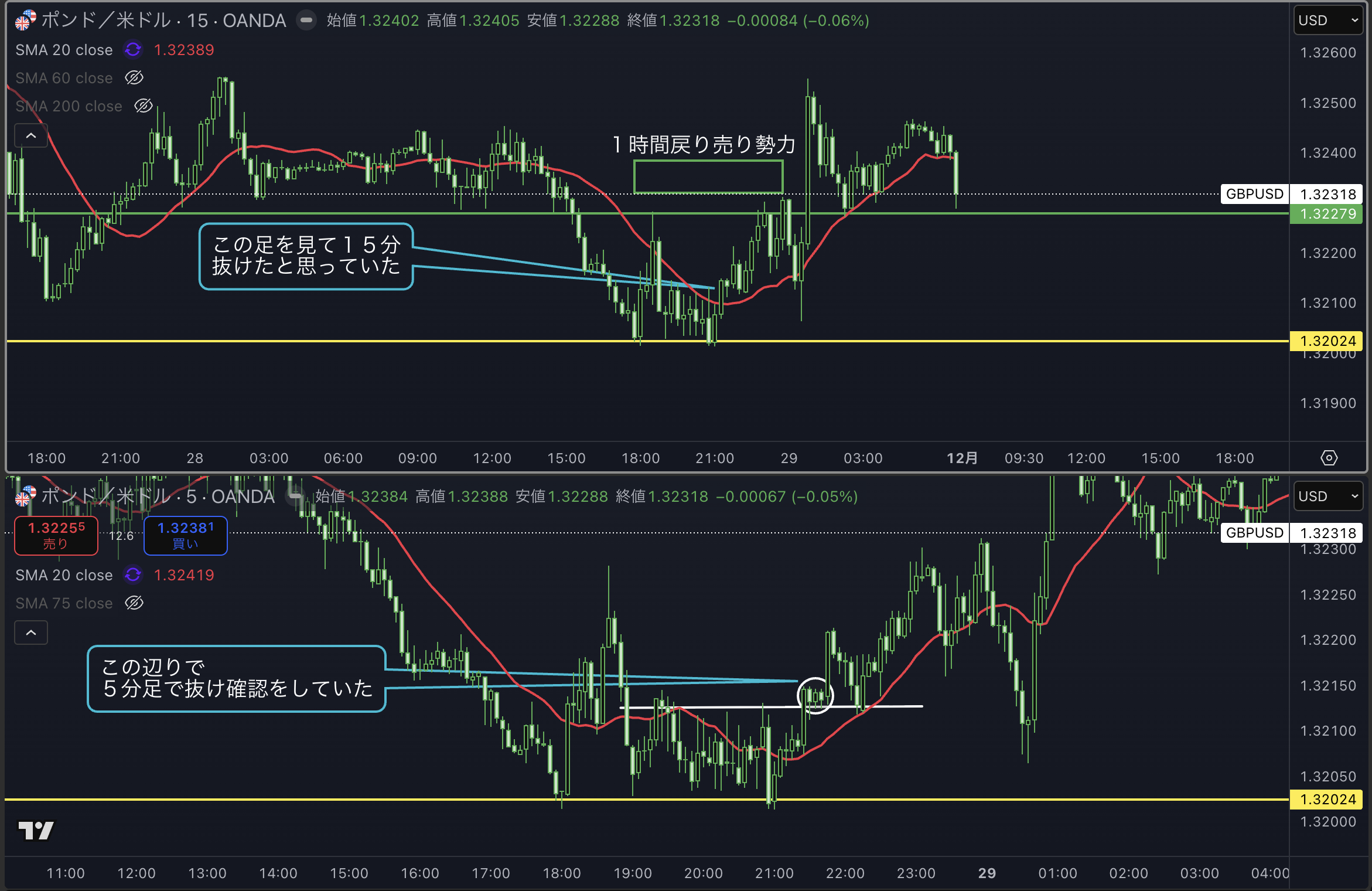 15分のMAの買い支えを無視して入ったので、結果下落しているが、ここは少し早かった。今後の改善ポイント。