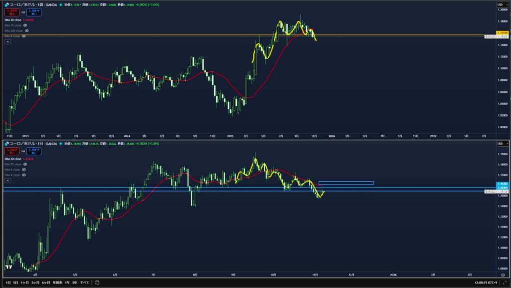 日足の戻り売りが入るのは大分先なので、その前に黄色の水平線まで戻ってくれば、