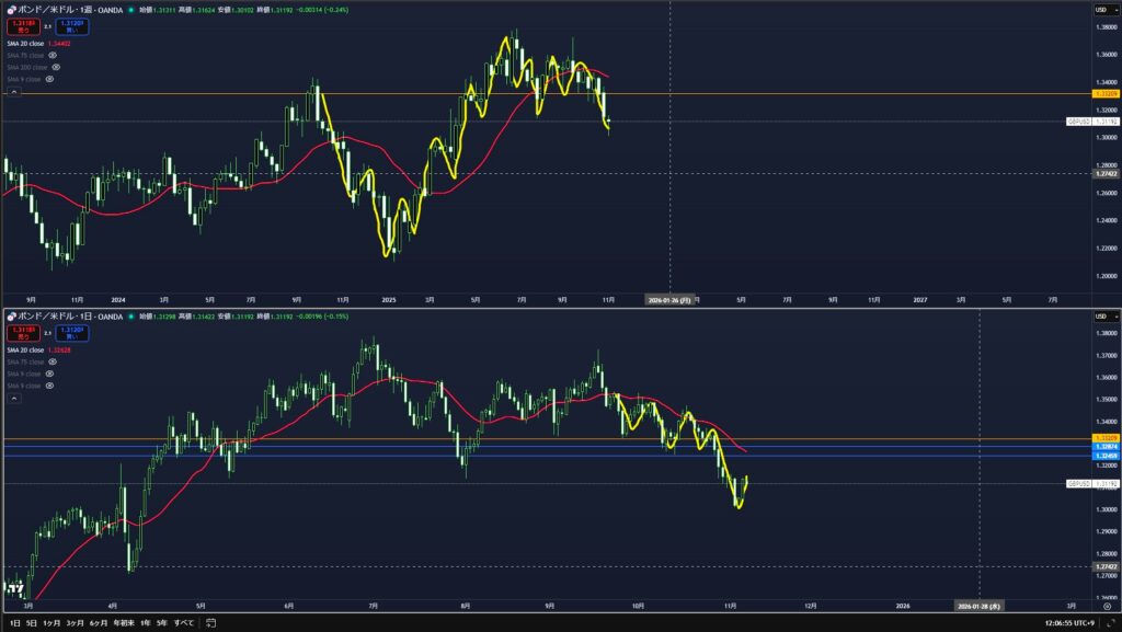 ユーロドルと同じで現時点で黄色の水平線まで戻って来ても、