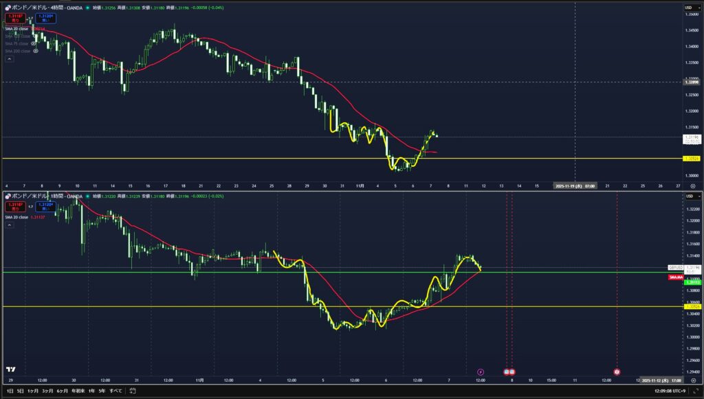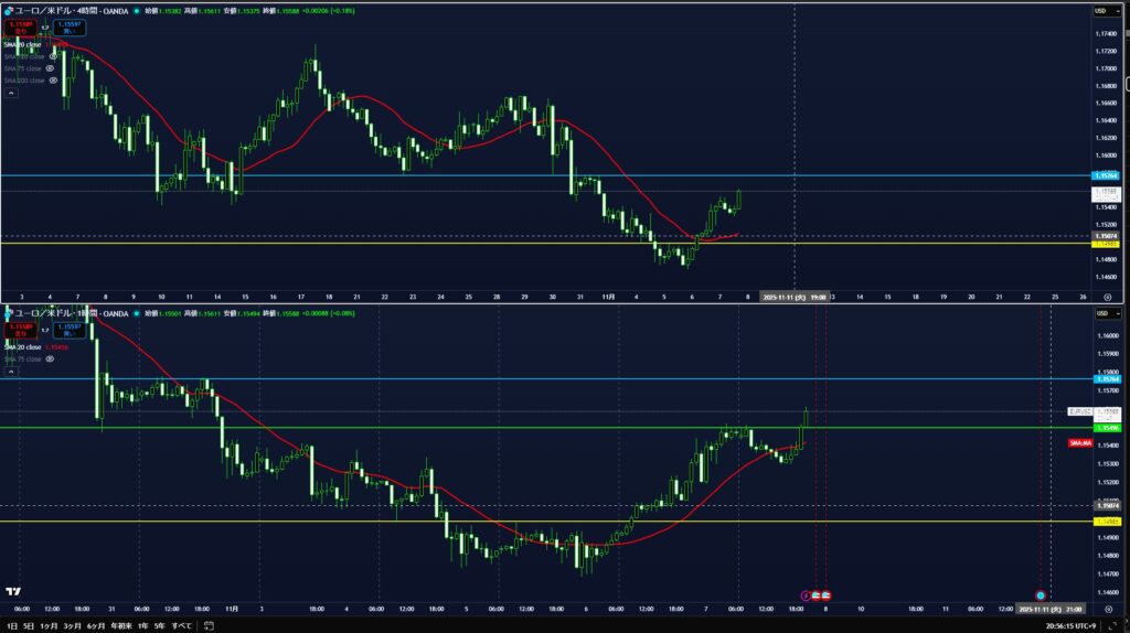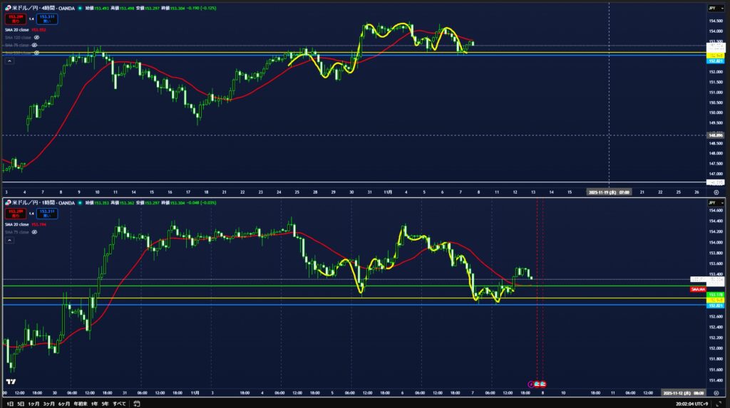 このまま黄色の水平線まで戻っても、4HのMAを割ってくるので狙えるかどうかが