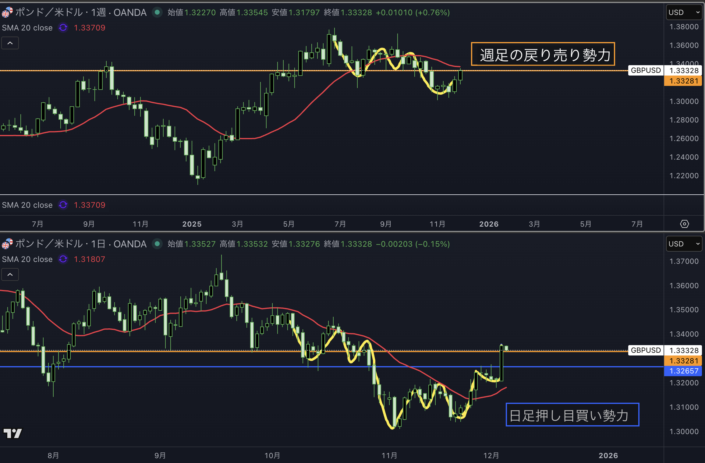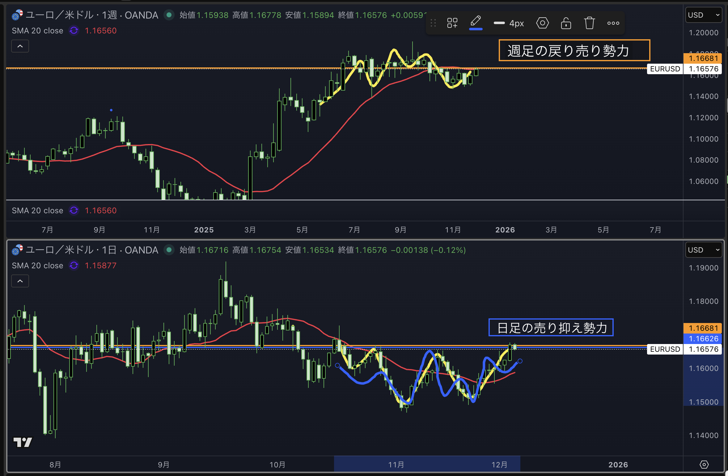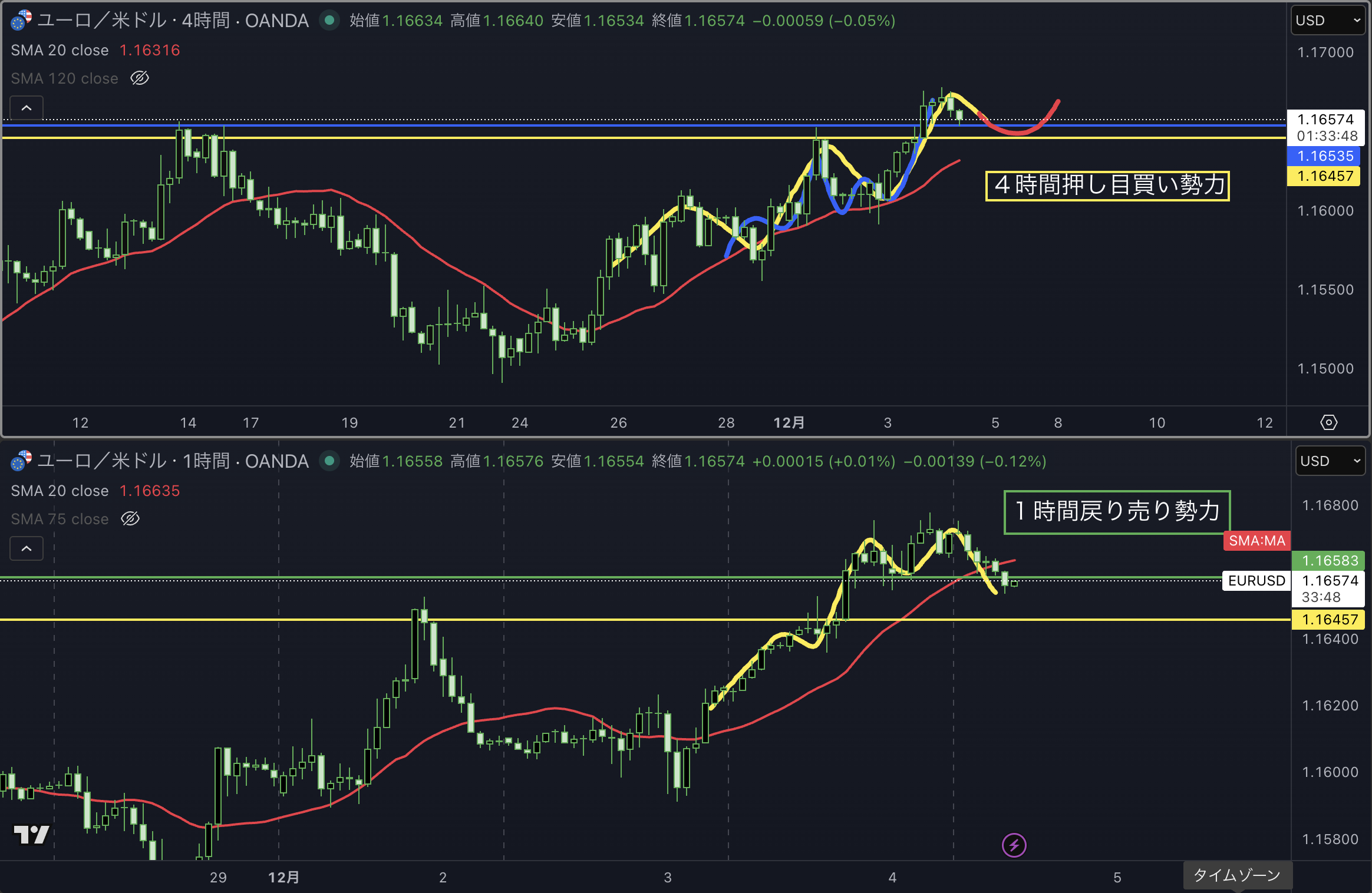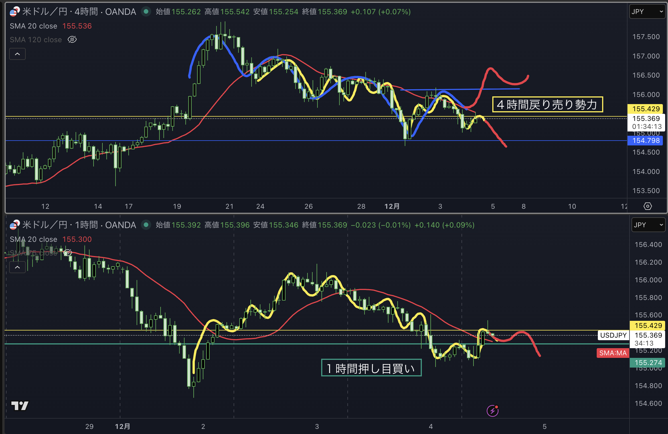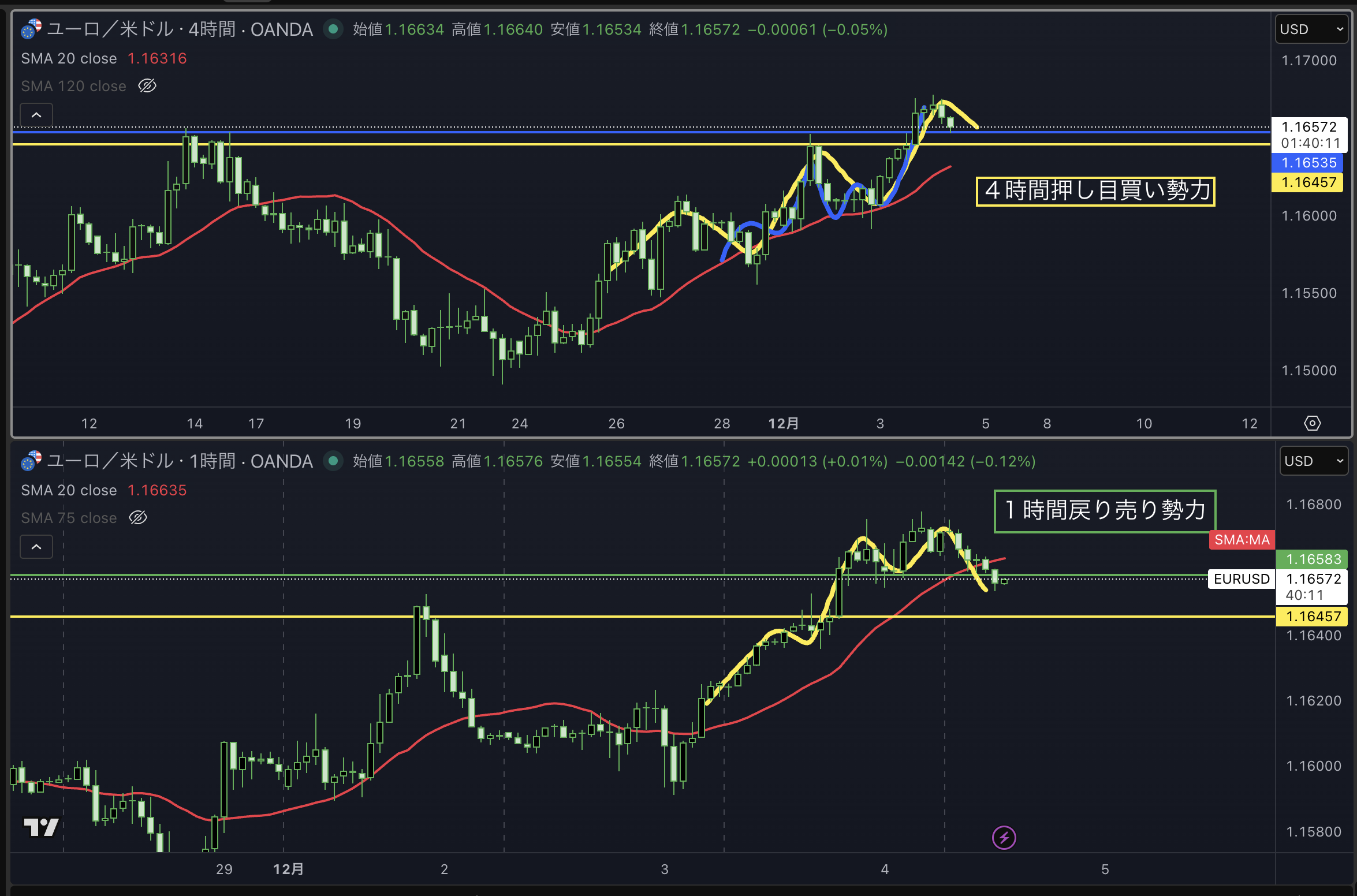 黄色のダウカウントだとすれば、NY時間に4時間の戻り売りが狙える可能性はある。