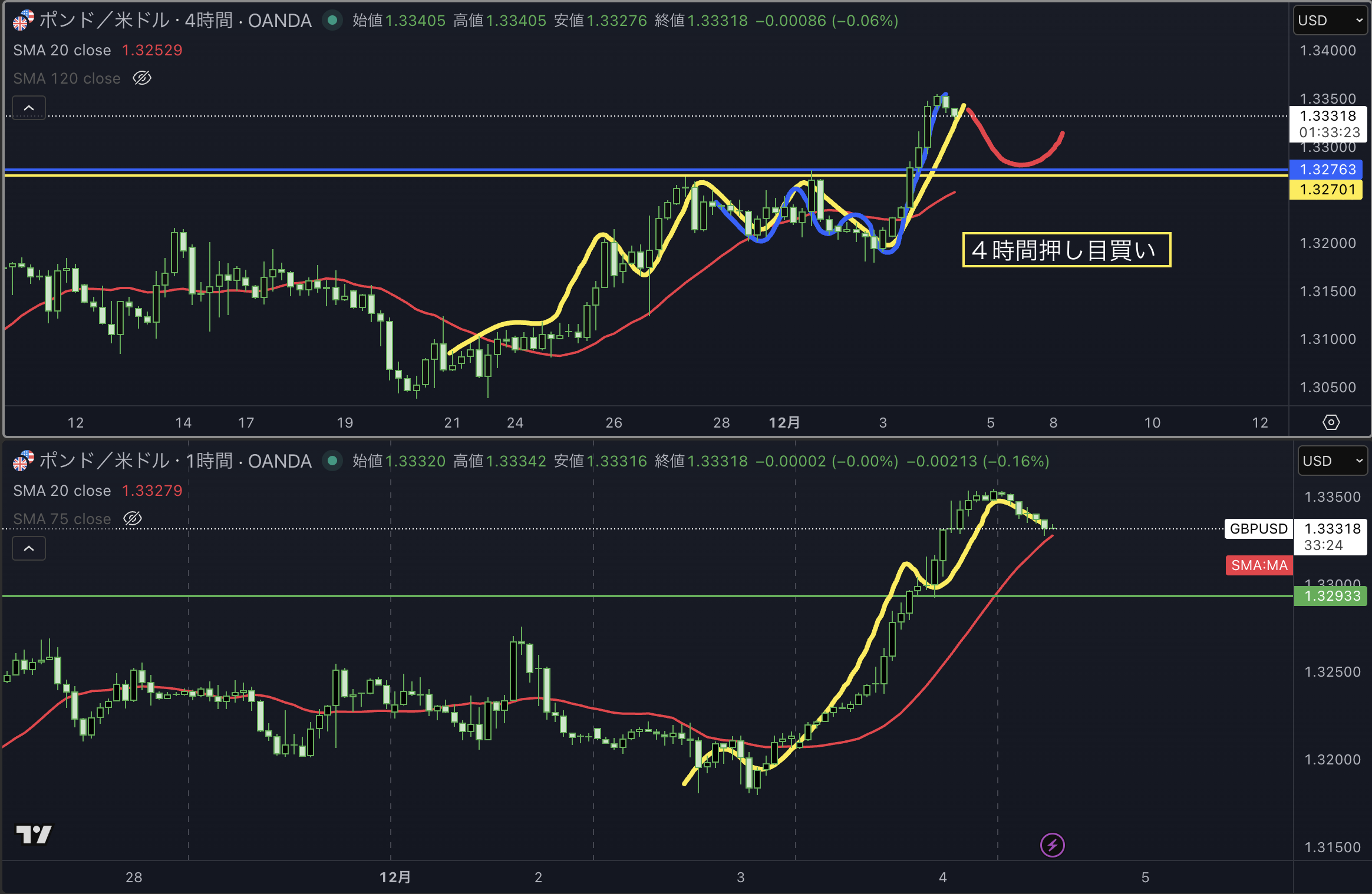 その場合は日足の押し目買い真上で、非常にリスク高いのでロットを抑えていく。